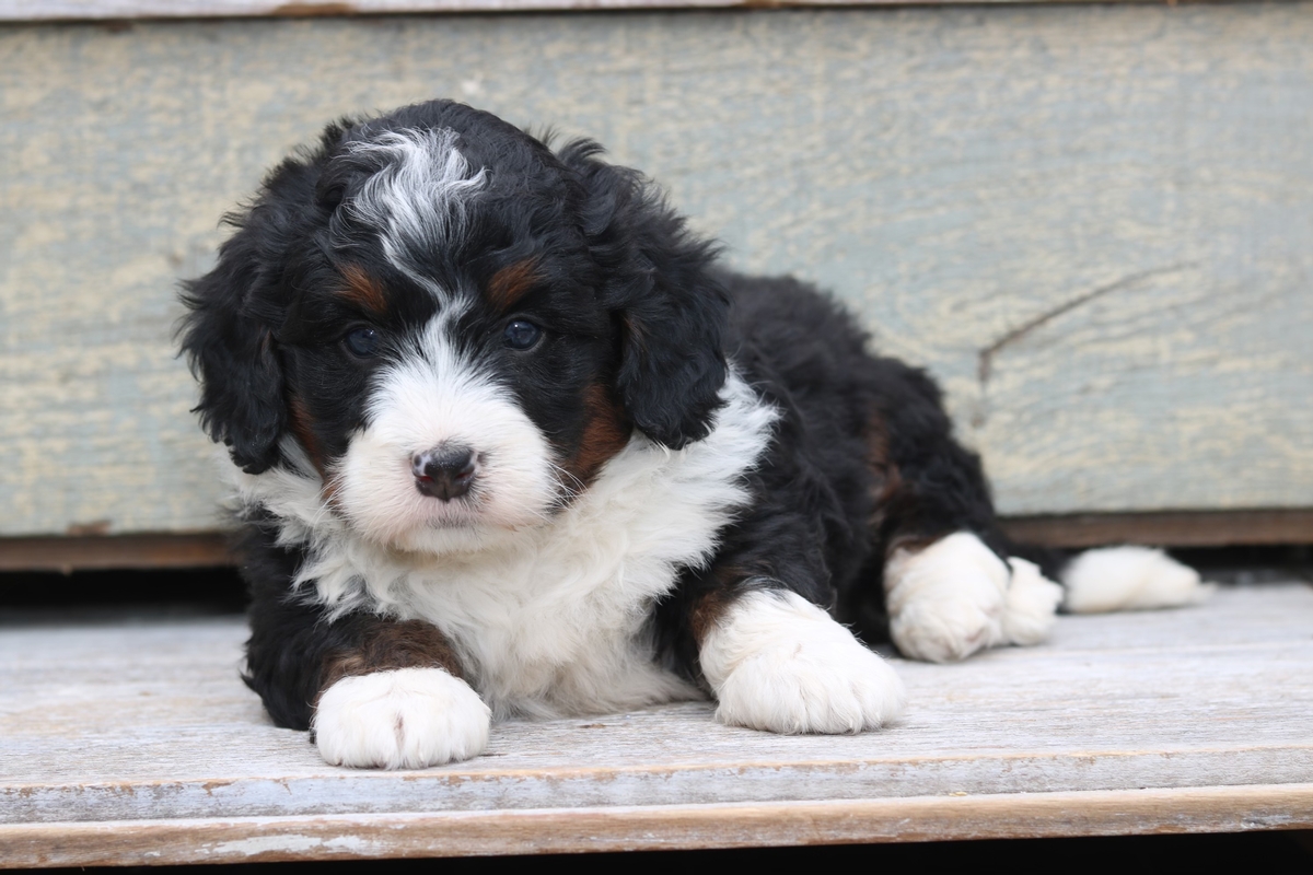 Baxer is a F1 Mini Bernedoodle boy that is expected to mature at appr. 25-45 pounds. Baxer will have a very Heavy-Wavey Black Tri colored coat, and is weighing 5.0 pounds as of 4/5/22 and is rated as having a medium Temperament based off of his litter of 6 mini bernedoodle puppies.