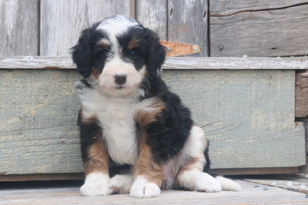 Cosy is a black tri f1 mini bernedoodle female born to Chanae and Jupiter that is expected to mature to approximately 25-45 pounds and have a wavy Black Tri colored coat. Cosy is weighing 5.4 pounds as of May the 31st and is rated as having a medium temperament based off her litter of 10 F1 Mini Bernedoodle litter.