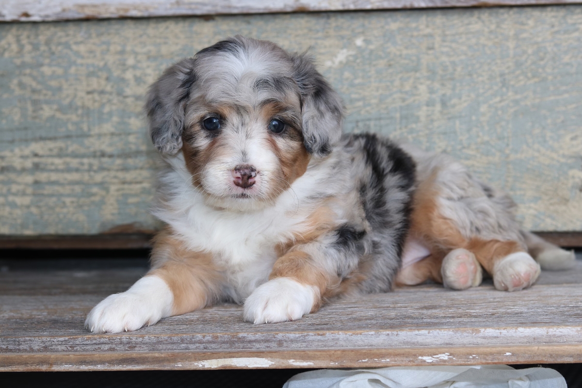 Dottie is A F1 Mini Bernedoodle girl that is expected to mature at appr. 30-50lb and have a very Heavy, Wavey Tri color Merle coat, she is weighing 4.5 pounds at 6 weeks old and is Rated as having a outgoing Temperament based off of her other siblings.