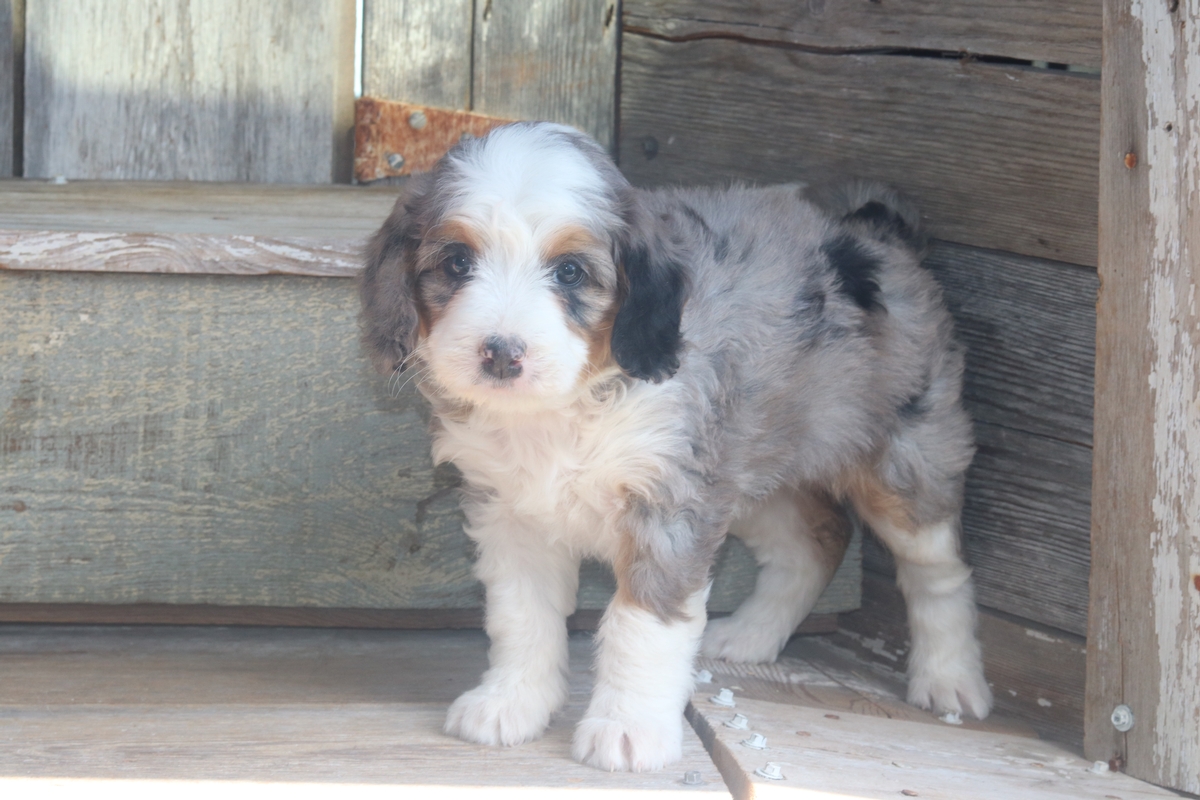 Duchess is a F1 Mini Bernedoodle female that is expected to mature at approximately 35-55 pounds and will have a Heavy-Wavey Merle colored coat with tri markings. Duchess weighs 6 pounds as of April the 13th and has a medium disposition based off her litter.