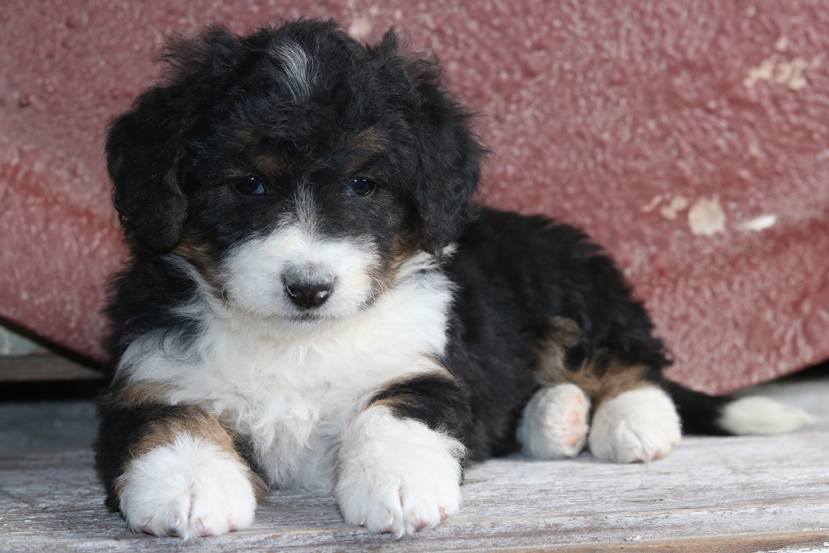 Fayde is a F1 Mini Bernedoodle girl that is expected to mature at appr. 25-45 lb and have a very Heavy, Wavey Tri color coat, she weighs 4.8 pounds at 6 weeks old and has a medium temperament in her litter of 7. Fayde can visually be identified as carrying a creeping gene which will cause her red-tan coloring to creep and as an adult she will likely resemble a Sable look vs a black tri.