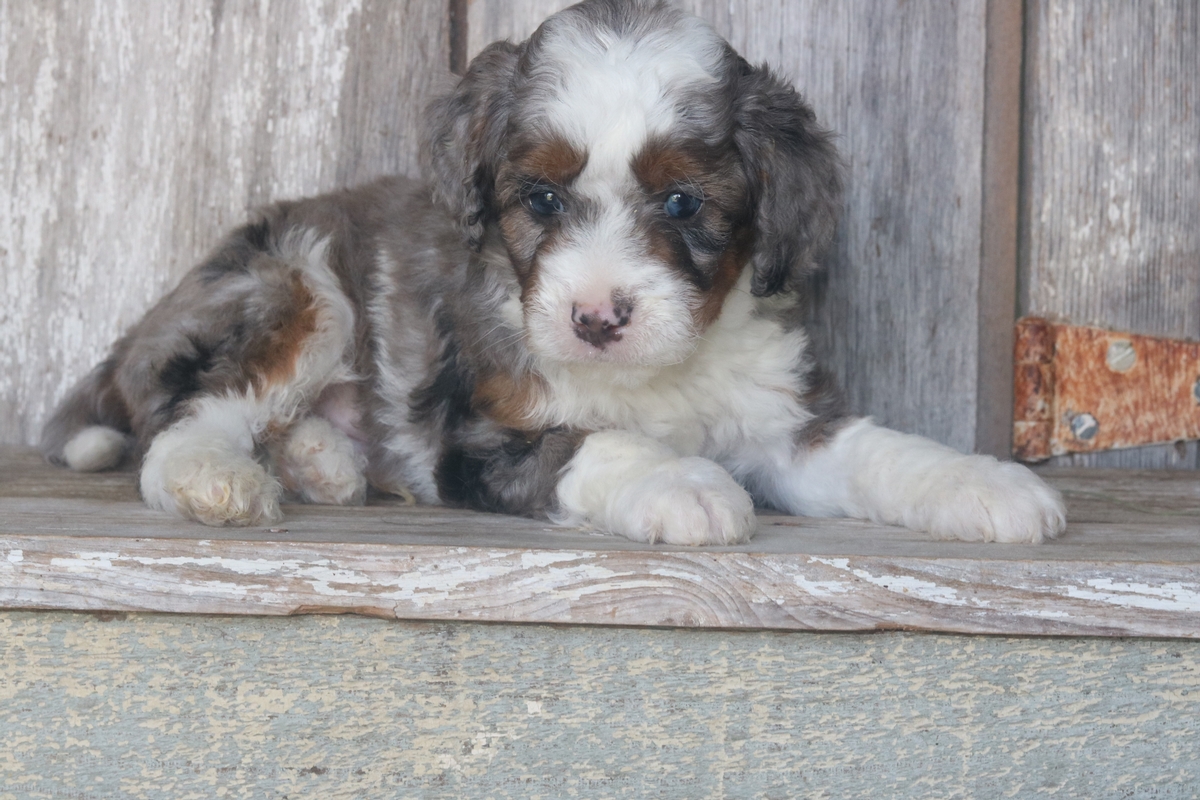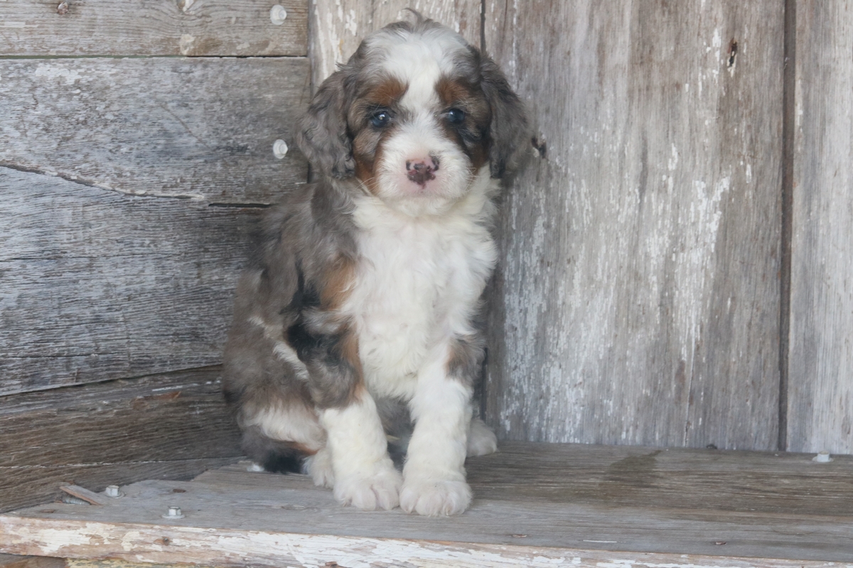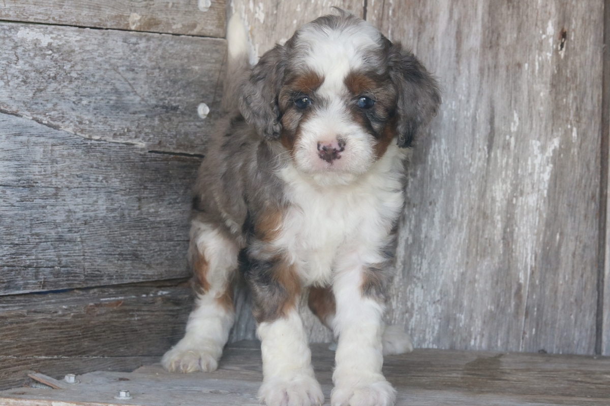 Hadewin born on August the 23rd to Layne and Remi, is a Merle F1b Tiny Bernedoodle boy that is expected to mature at approximately 15-35 pounds and will have a heavy/wavy coat and 2 partial blue eyes. Hadewin is weighing 3.2 pounds as of 10/3 and is rated as having a medium disposition based off his litter.