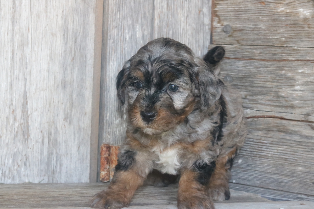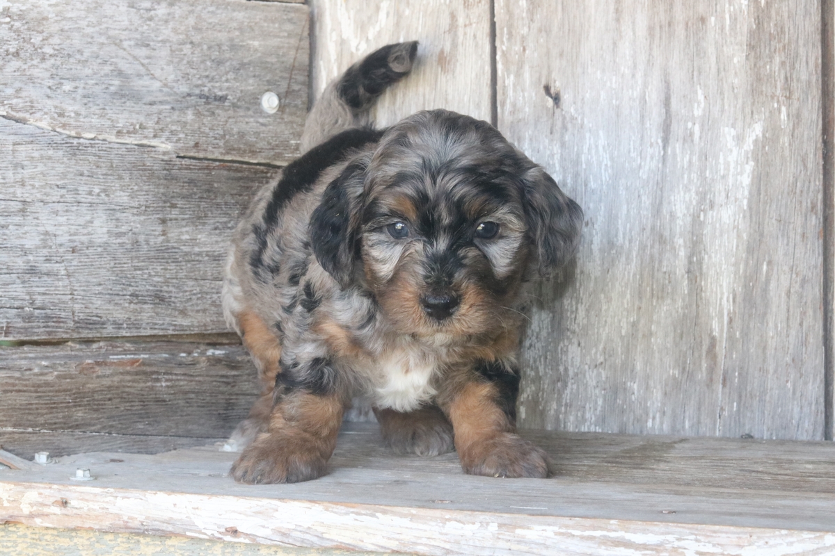 Hanjo was born on August the 23rd to Layne and Remi. He is a bi-colored Merle F1b Tiny Bernedoodle boy that is expected to mature at approximately 15-35 pounds and will have a heavy/wavy coat. Hanjo weighs 3 pounds and has a medium temperament based off his siblings.