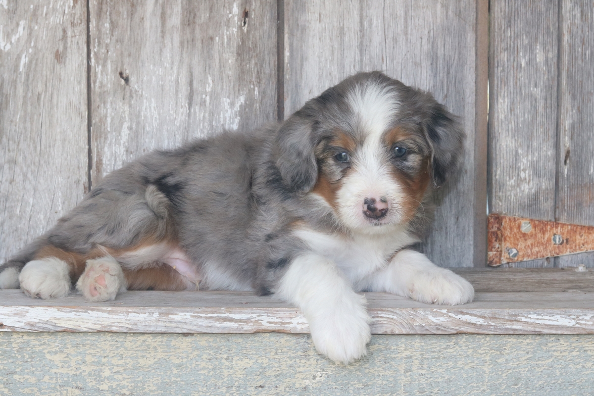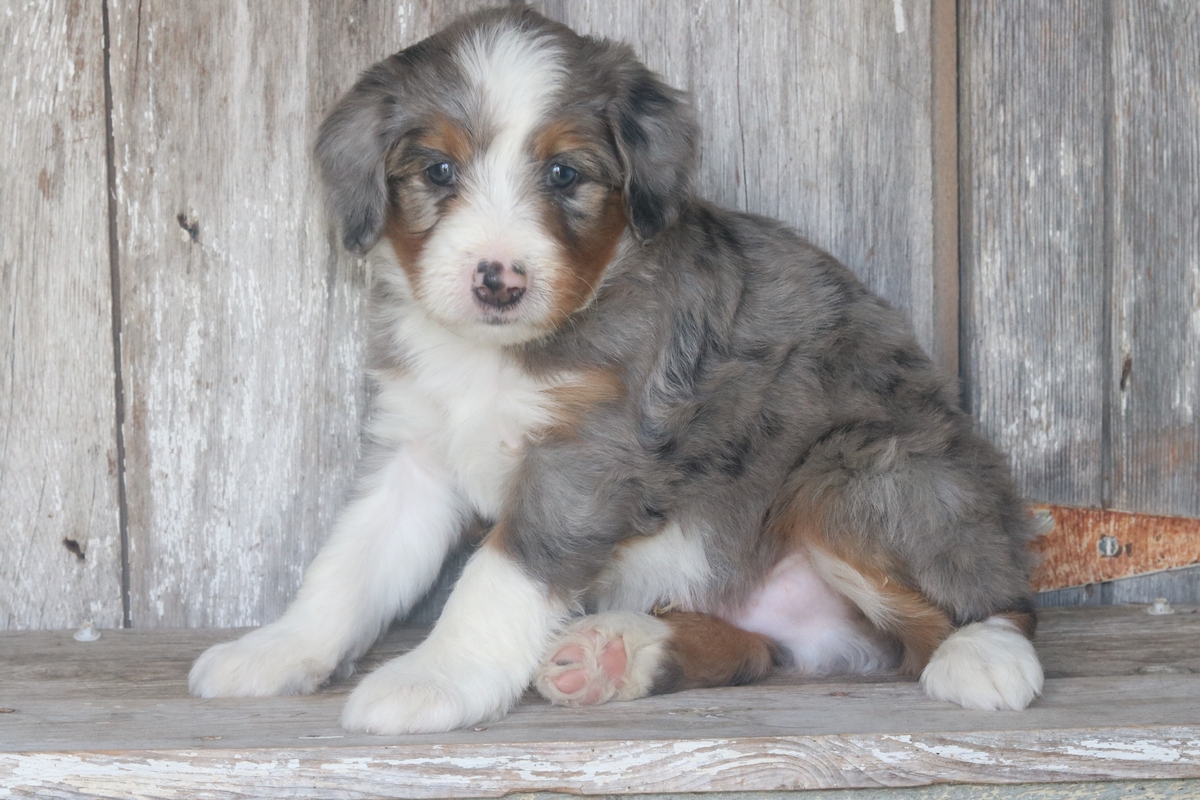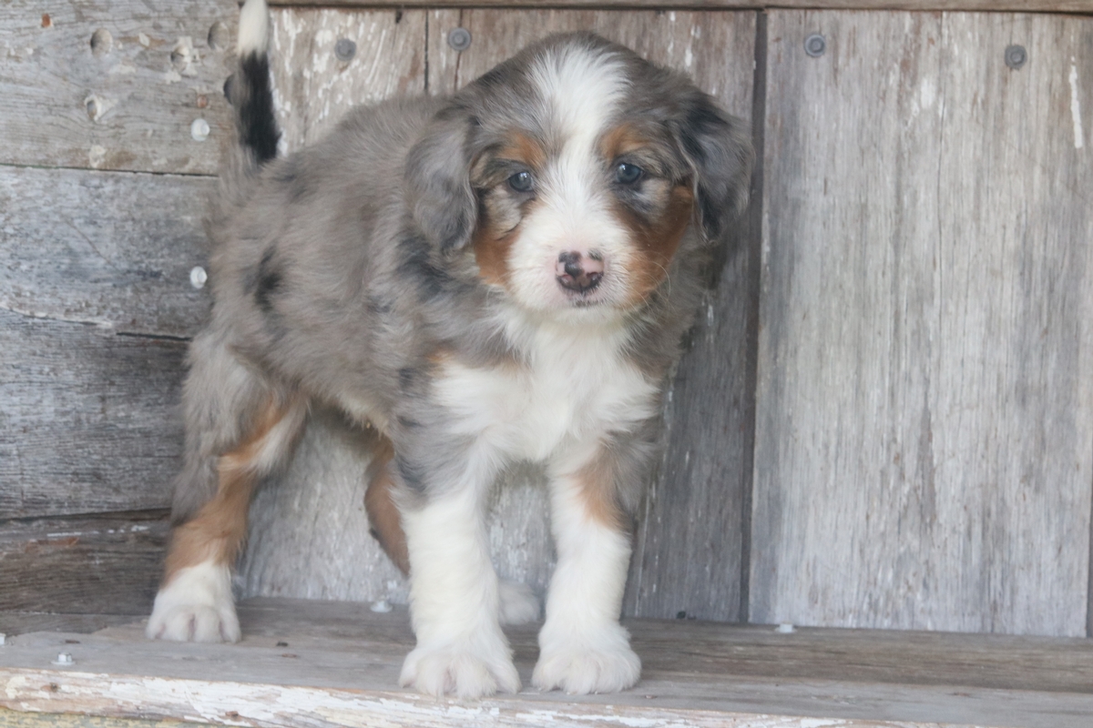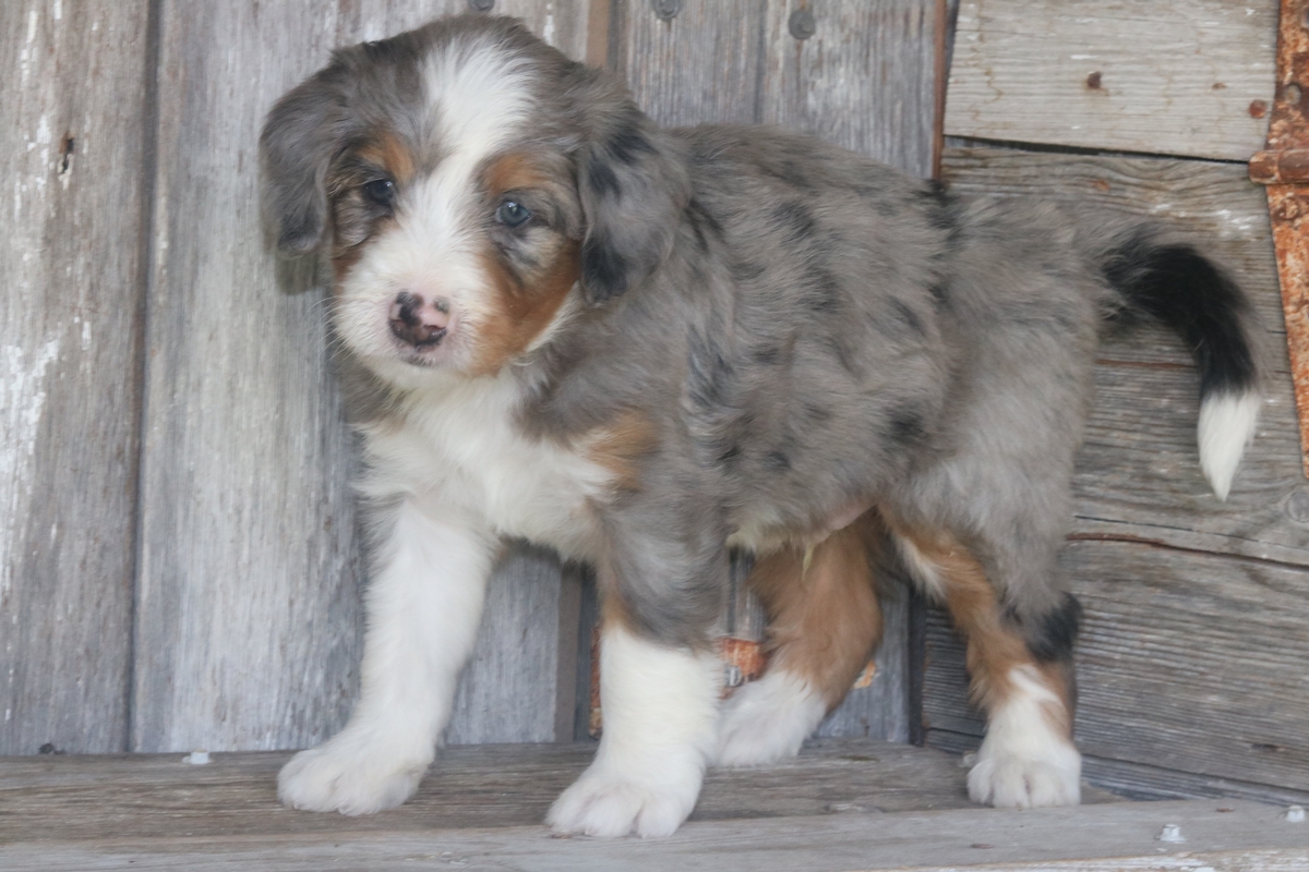 Icos, born on 8/23/2025 to Lily and Teddy is a Merle male with Tri colored markings. Icos is a Standard Bernedoodle male that is expected to mature at approximately 65-85 pounds and have a heavy wavy coat. Icos weighs 7.5 pounds and has an outgoing temperament based off his liter of standard bernedoodles.