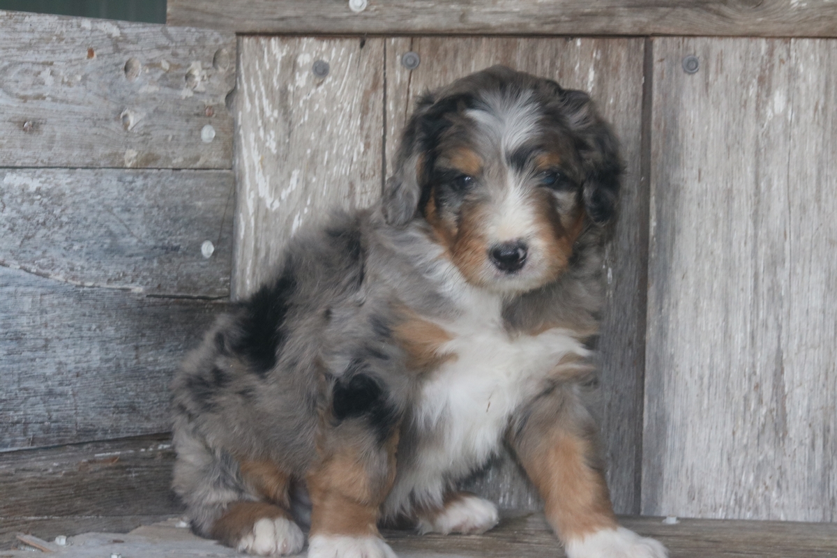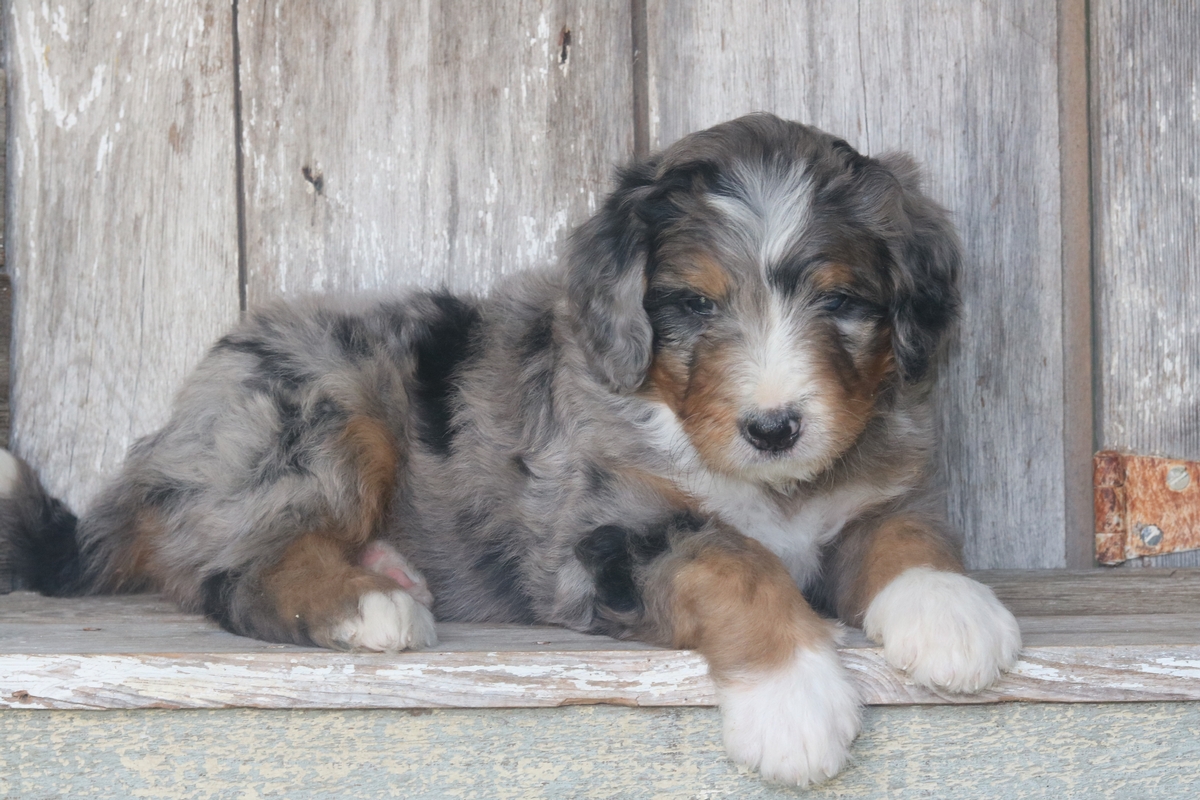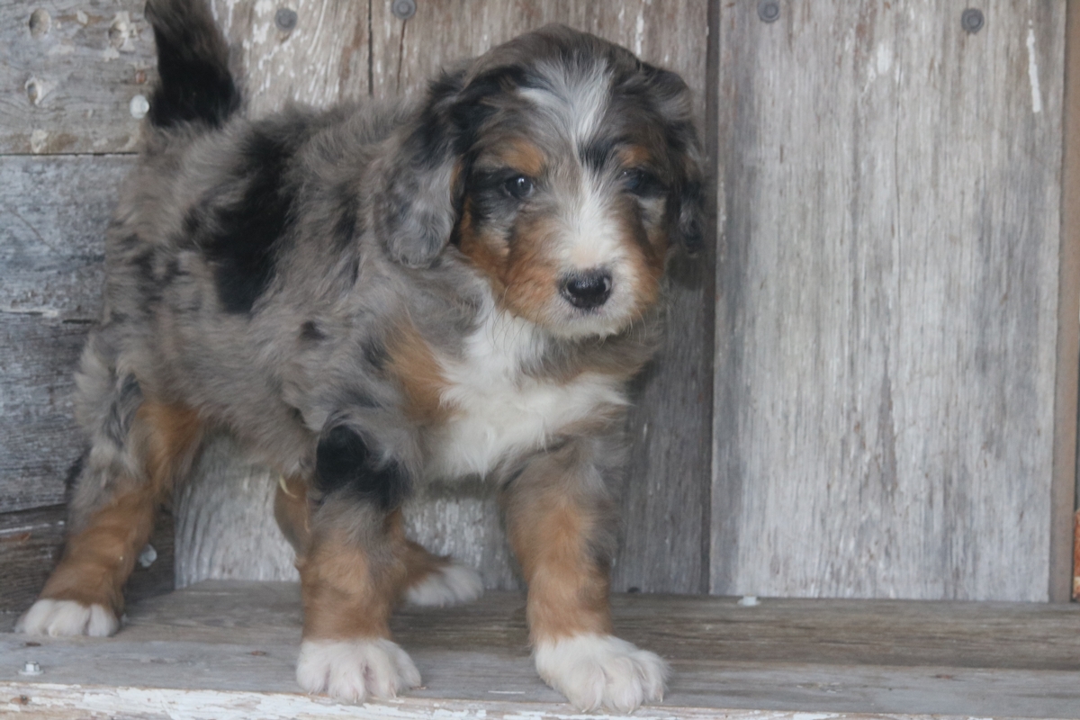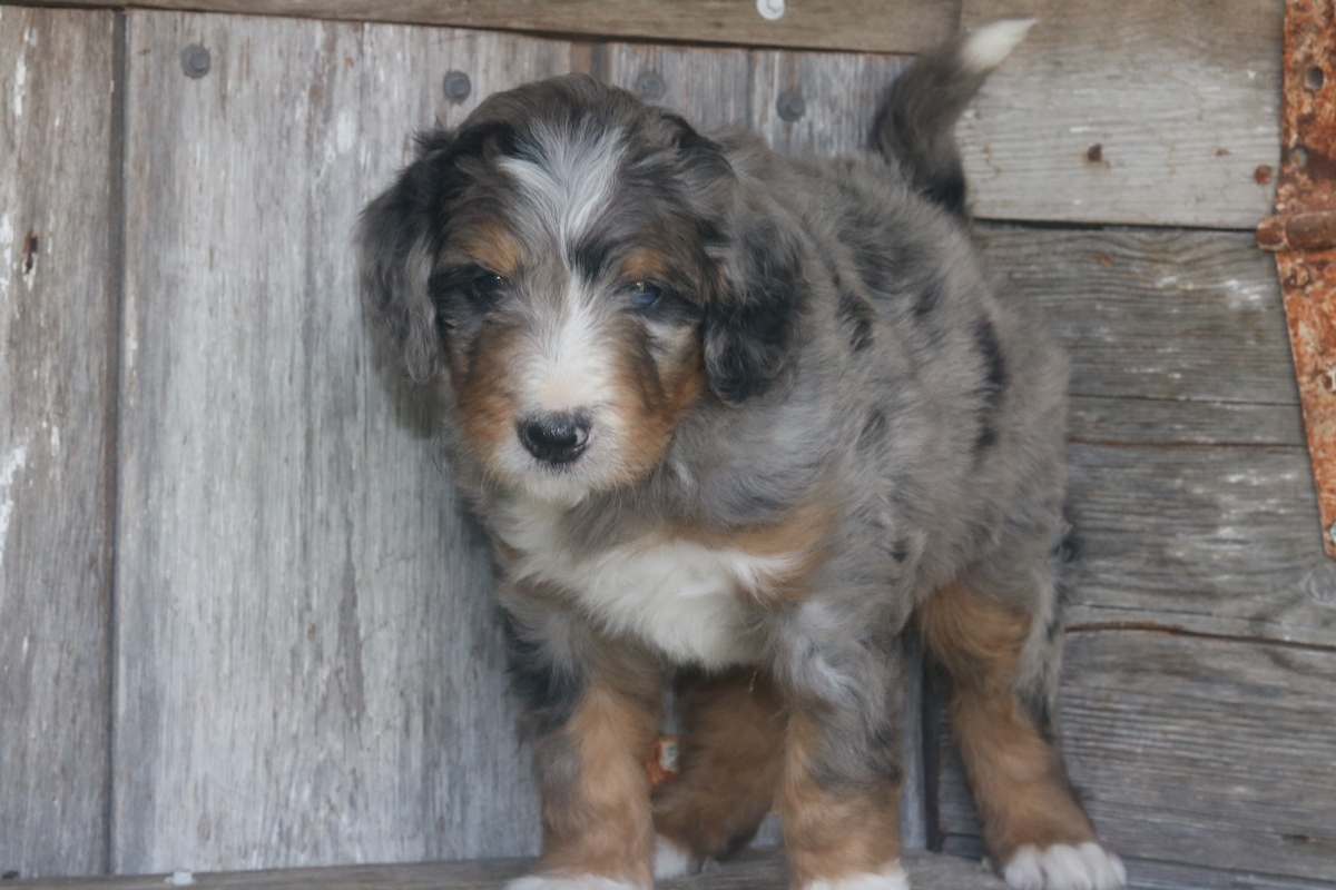 Ilex, born on 8/23/2025 to Lily and Teddy is a Merle male with Tri colored markings. Ilex is a Standard Bernedoodle boy that is expected to mature at approximately 65-85 pounds and have a heavy wavy coat with a partial blue eye. Ilex is weighing 8.2 pounds as of October the 3rd and is rated as having a medium temperament.