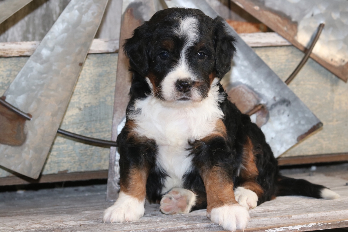 Ilton is a F1 Mini Bernedoodle male that is expected to mature at appr. 35-55lb and have a very Heavy/Wavey tradition black tri coat, he weighs 6.2 pounds at 6 weeks old and he has a medium Temperament based off of his siblings.