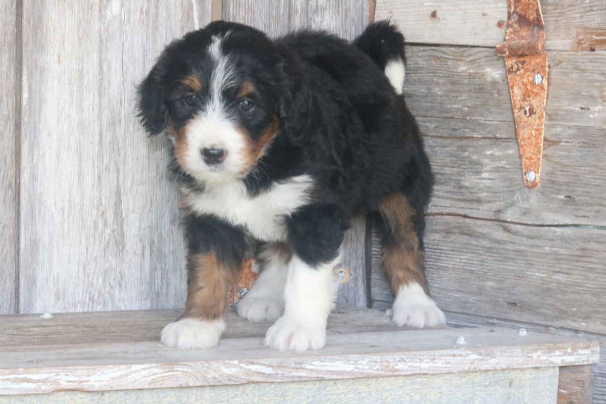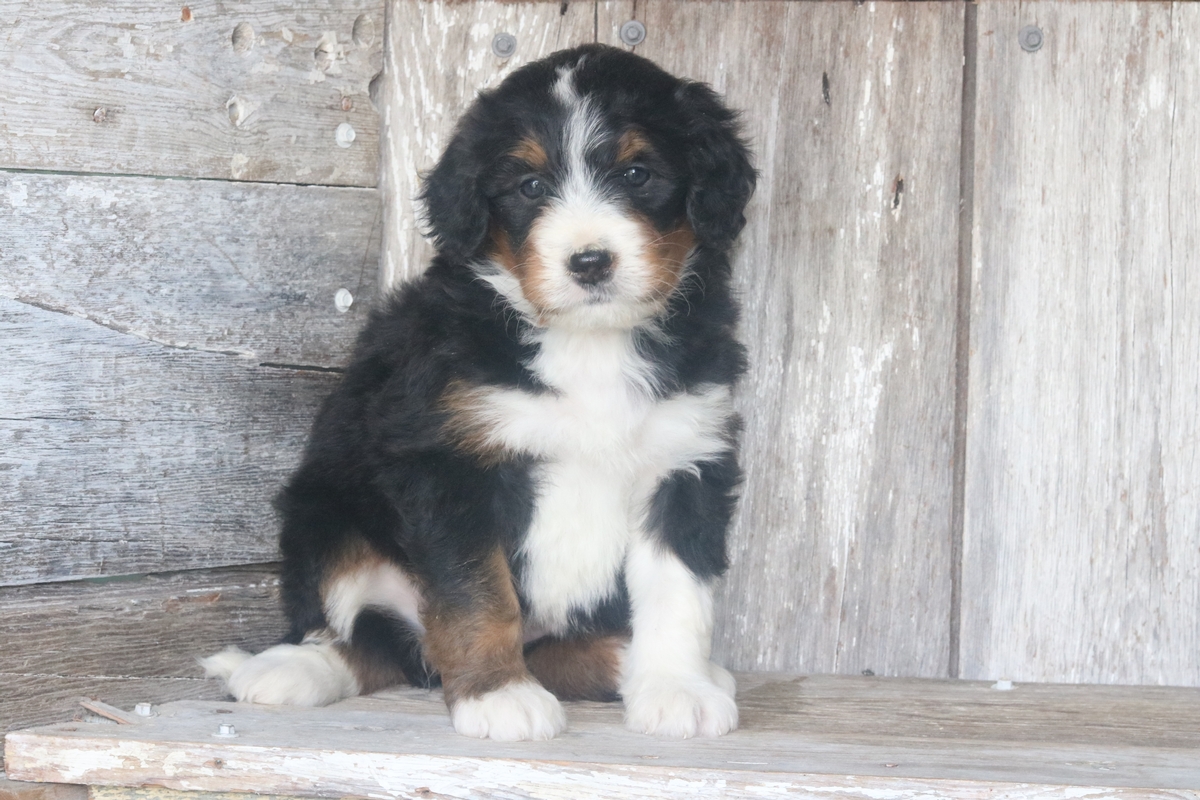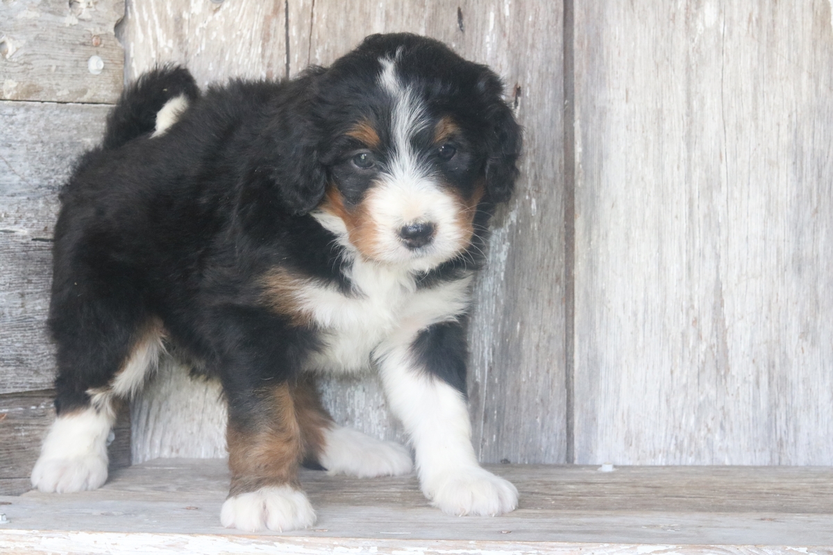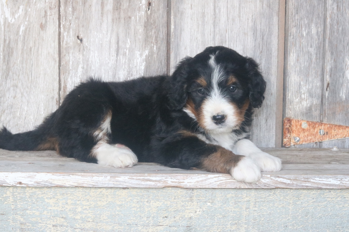 Indyi was born on August the 23rd to Lily and Teddy. She is a black tri colored standard female, she is a Standard Bernedoodle female that is expected to mature at approximately 65-85 pounds and have a heavy wavy coat. Indyi is weighing 6.7 pounds and has a medium temperament.