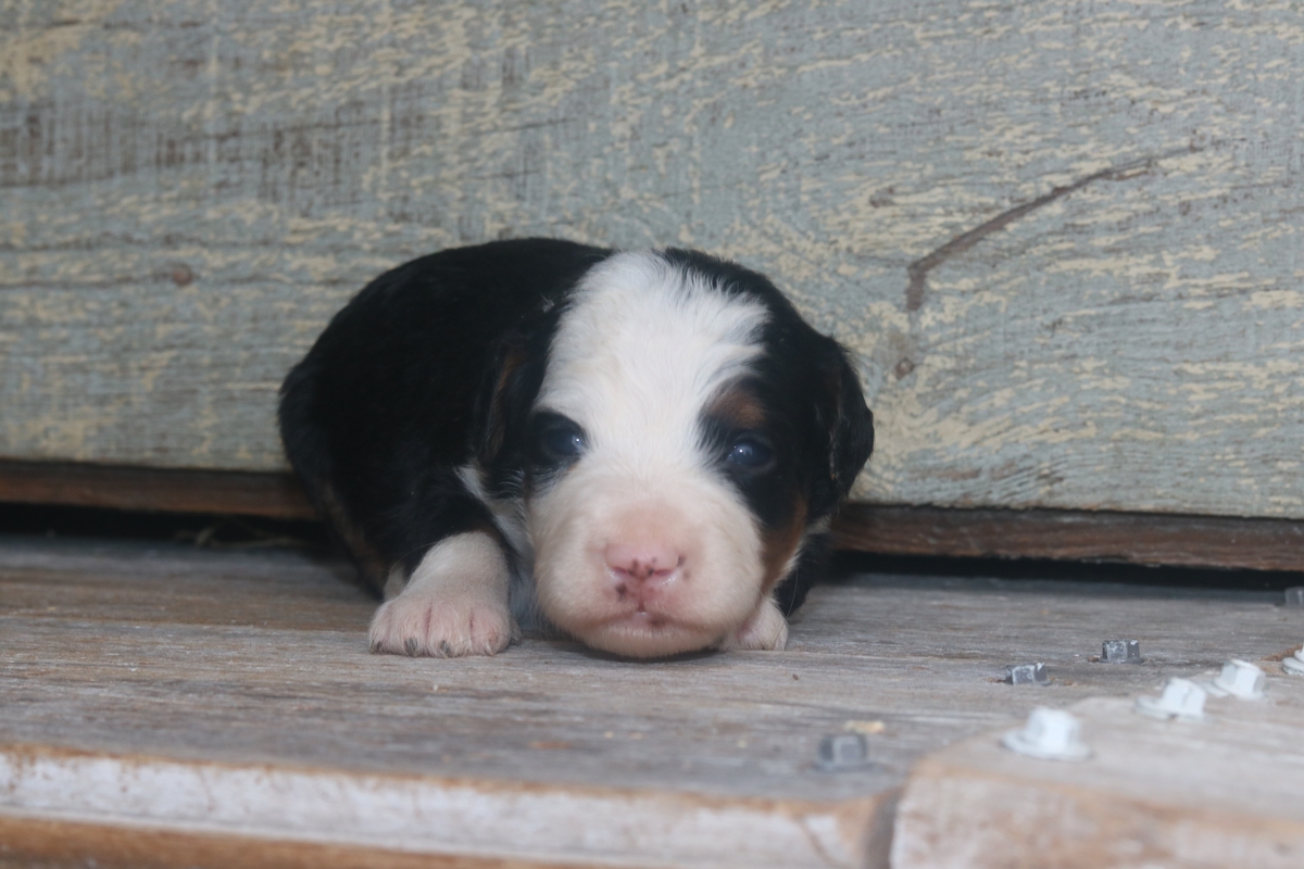 Jacksyn is a black tri F1 Mini Bernedoodle male born to Bella and Jupiter and expected to mature at approximately 30-50 pounds and will have a wavy coat. Jacksyn has a medium temperament and is weighing 6.8 pounds as of 11/14/23.