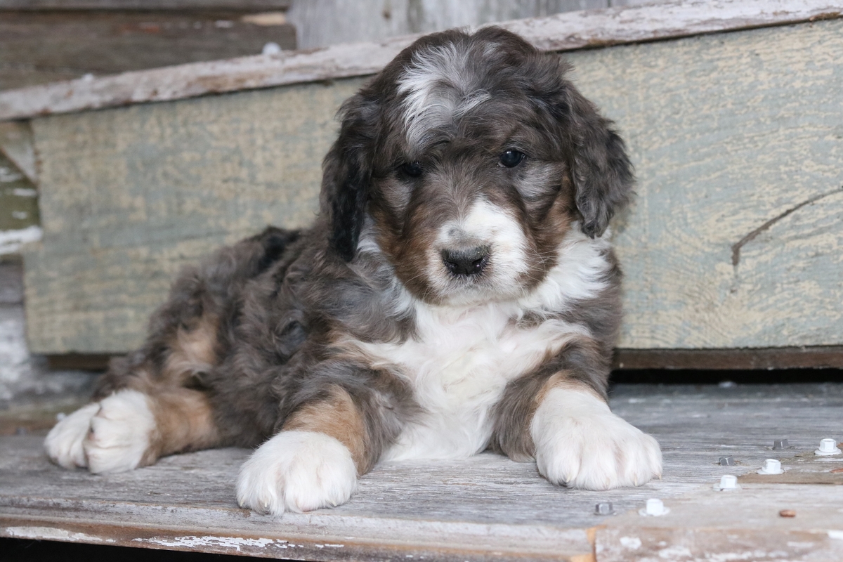 Jefferson is A Blue Merle Tri Color, F1 Standard Bernedoodle boy that is expected to mature at 80 - 100 pounds, he is the largest, most mellow Bernedoodle boy in his litter, and could possibly exceed weight range.He will have that typical Wavey Bernedoodle coat, weighs 10.4 pounds at 6 weeks old and has a laidback dispositions in his litter of 7 standard bernedoodle puppies.