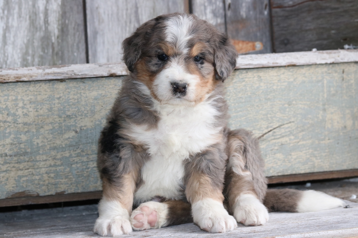 Jissa is A F1 Standard Bernedoodle girl that is expected to mature at approximately 60-80 pounds and have a Wavey Tri color coat, she weighs 7.9 pounds at 6 weeks old and has a medium disposition in her litter of 7 standard bernedoodle puppies.