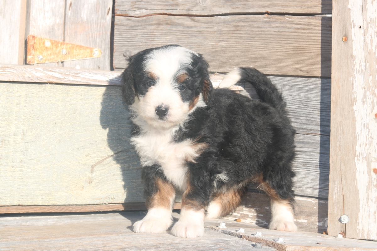 Joie is a black tri F1 Mini Bernedoodle female born to Bella and Jupiter, expected to mature at approximately 30-50 pounds and will have a wavy coat. Joie has a medium disposition and is weighing 4.9 pounds as of 11/14/23.