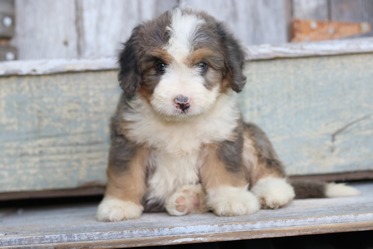Kalle is a F1 Mini Bernedoodle female born to Roxie and Bentley, that is expected to mature at approximately 30-50 lbs and have a very Heavy/Wavey Tri colored Merle coat. She is weighing 6.3 pounds as of 6/30/22 old and is rated as having a medium temperament based off of her litter.