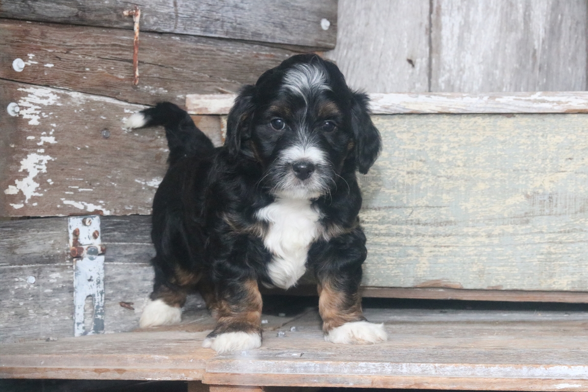 Kayle, born to Reagan and Layne is a Black Tri F1b Micro Mini Bernedoodle boy. Kayle is expected to mature at approximately 15-30 pounds with more of a short compact build and will have a heavy/wavy coat. Kayle weighs 5.5 pounds as of 12/26/23 and is rated as having an outgoing temperament.