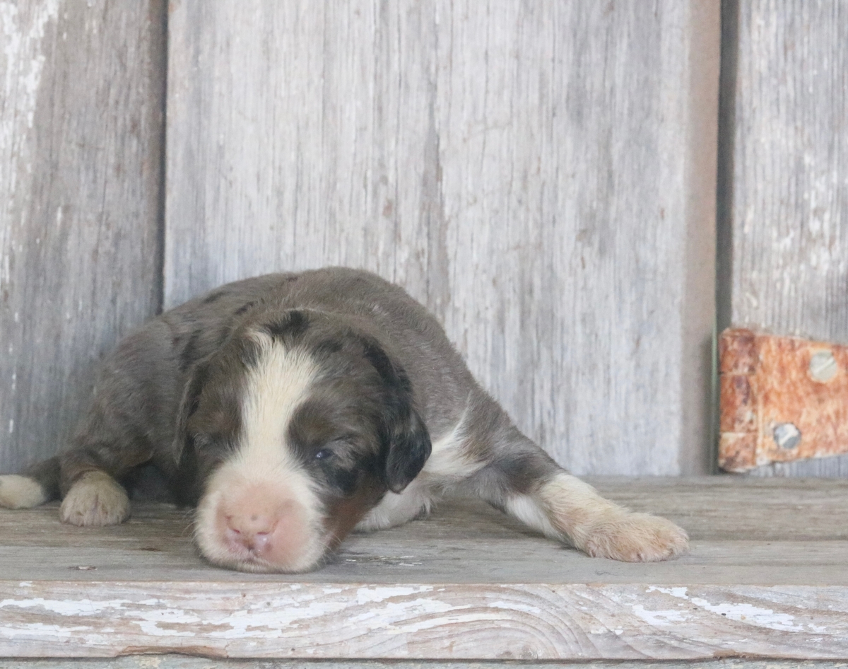 Lacus was born on 11/11/2025 to Sybil and Layne, he is a Merle tri colored boy with traditional tri colored markings. He is a F1 Mini Bernedoodle male that is expected to mature at approximately 30-50 pounds and have a heavy/wavy coat.