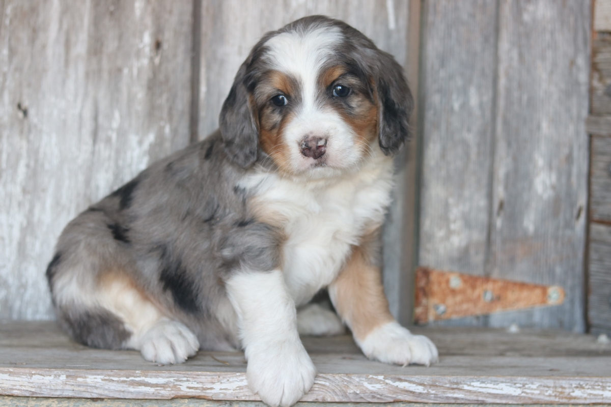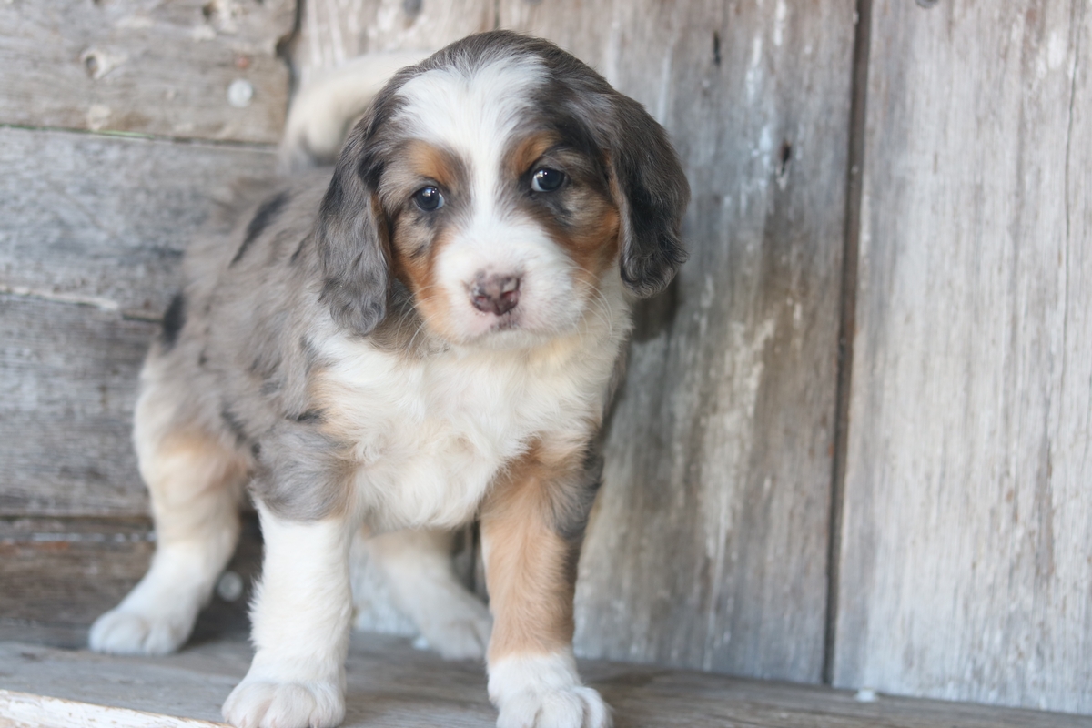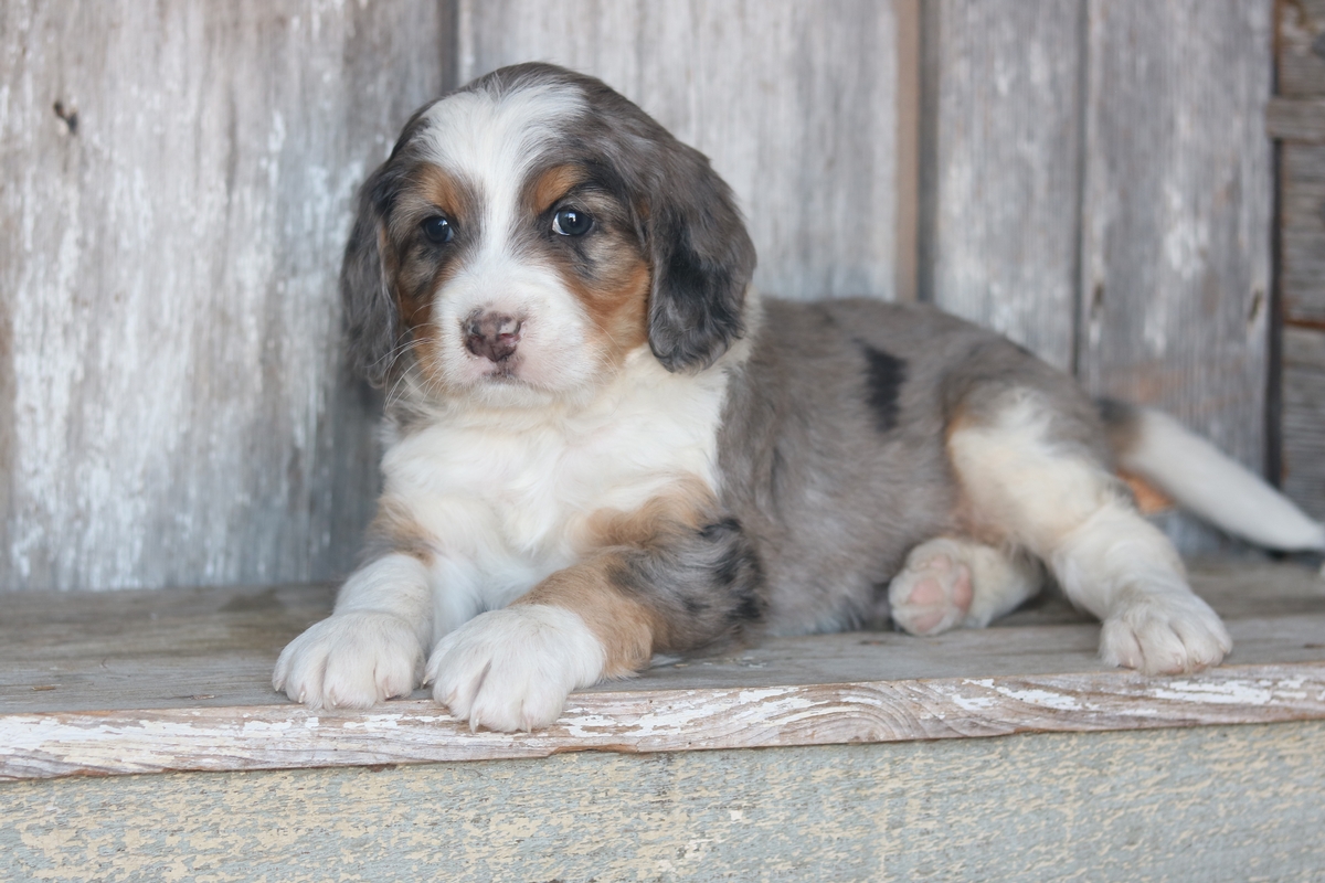 Lacus was born on 11/11/2025 to Sybil and Layne, he is a Merle tri colored boy with traditional tri colored markings. He is a F1 Mini Bernedoodle male that is expected to mature at approximately 30-50 pounds and have a heavy/wavy coat. Lacus weighs 6.8 pounds as of 12/21/25 and has a medium disposition.