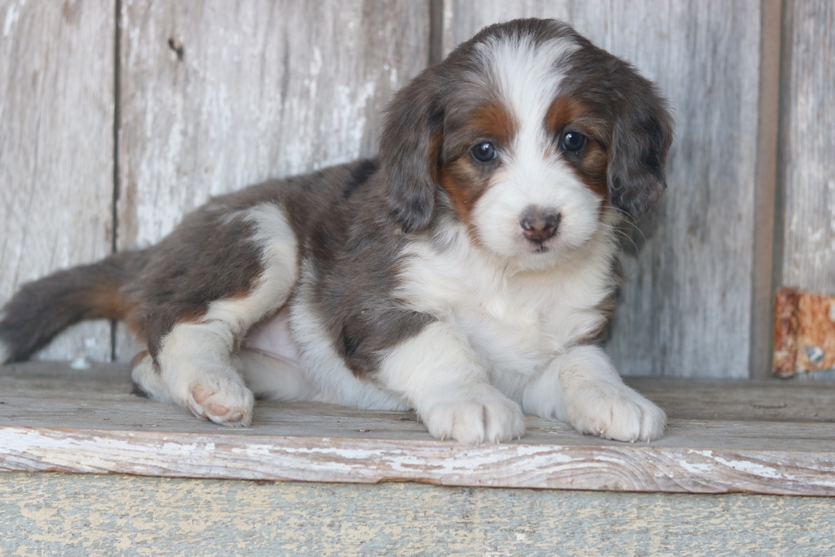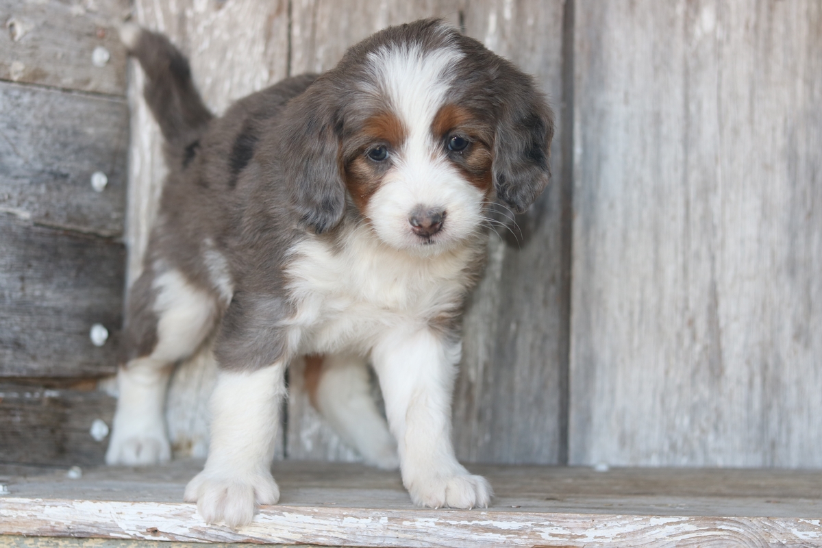 Laley is a F1 Mini Bernedoodle girl that is expected to mature at approximately 30-50 pounds that was born to Sybil and Layne. She will have a Heavy-Wavey Merle colored coat with tri colored markings. Laley is rated as having a laid back disposition based off her siblings, she weighs 5.7 pounds as of 12/21/2025.