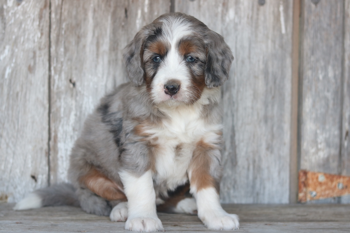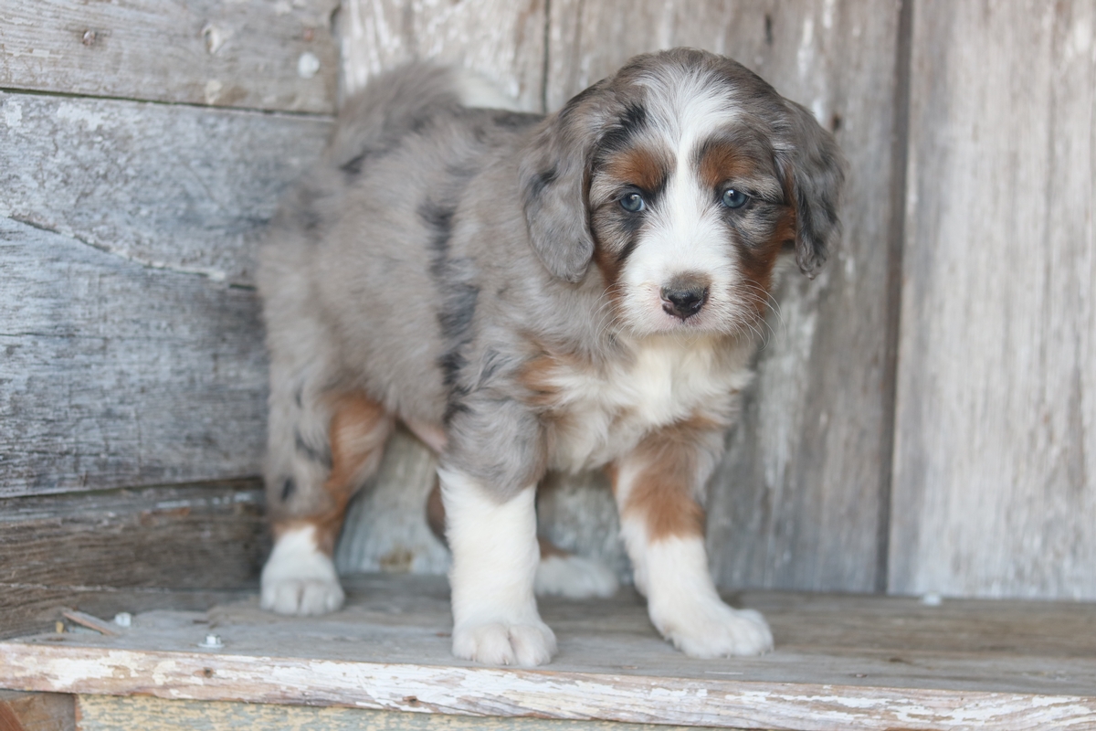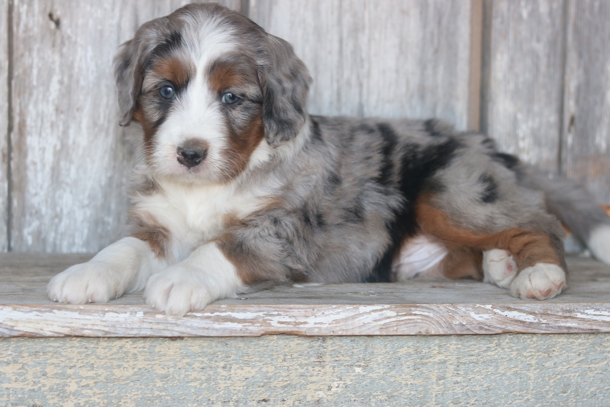 Lazar was born on 11/11/2025 to Sybil and Layne, he is a Merle tri with traditional tri colored markings. He is a F1 Mini Bernedoodle male that is expected to mature at approximately 30-50 pounds and have a heavy/wavy coat. Lazar has a medium temperament based off his litter of 11 and is weighing 6.0 pounds as of 12/21/2025.