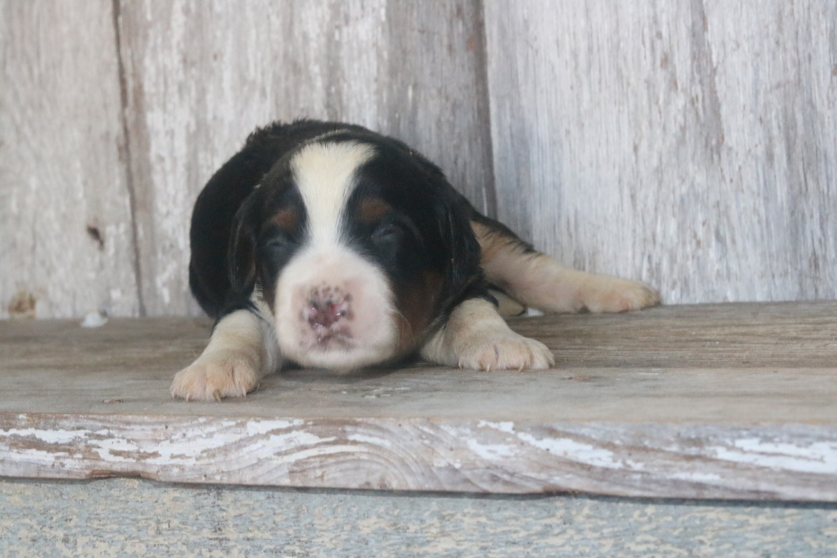 Lexo was born on 11/11/2025 to Sybil and Layne, he is a Black tri colored boy with tri colored markings. He is a F1 Mini Bernedoodle male that is expected to mature at approximately 30-50 pounds and have a heavy/wavy coat.