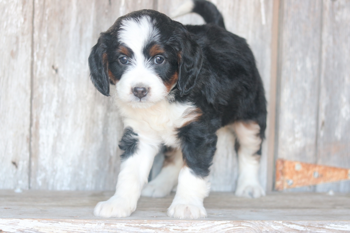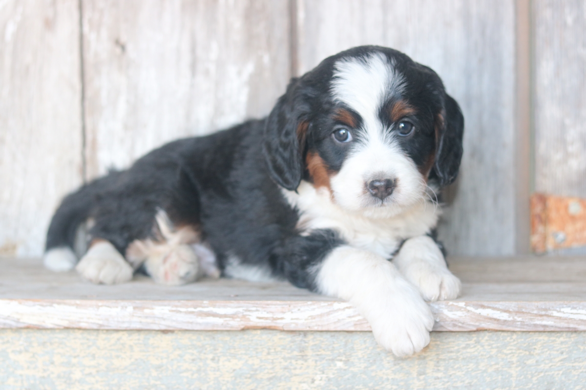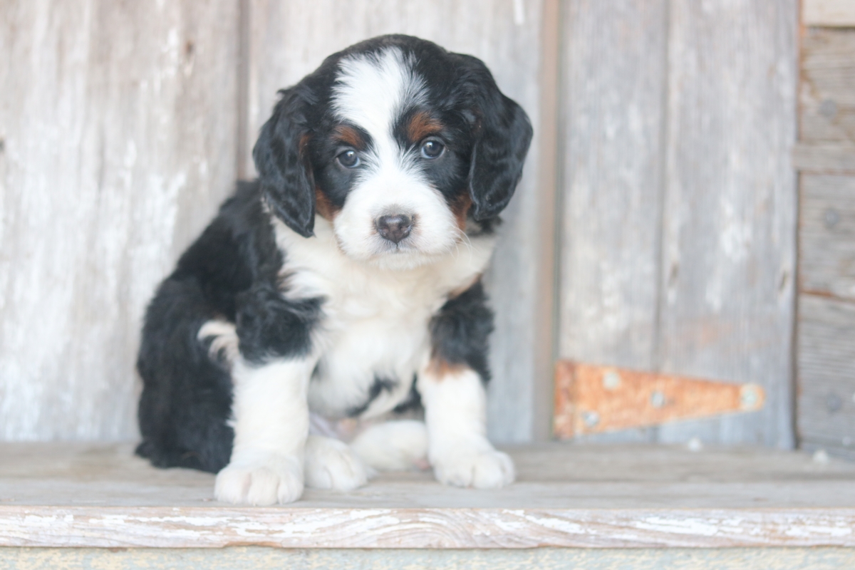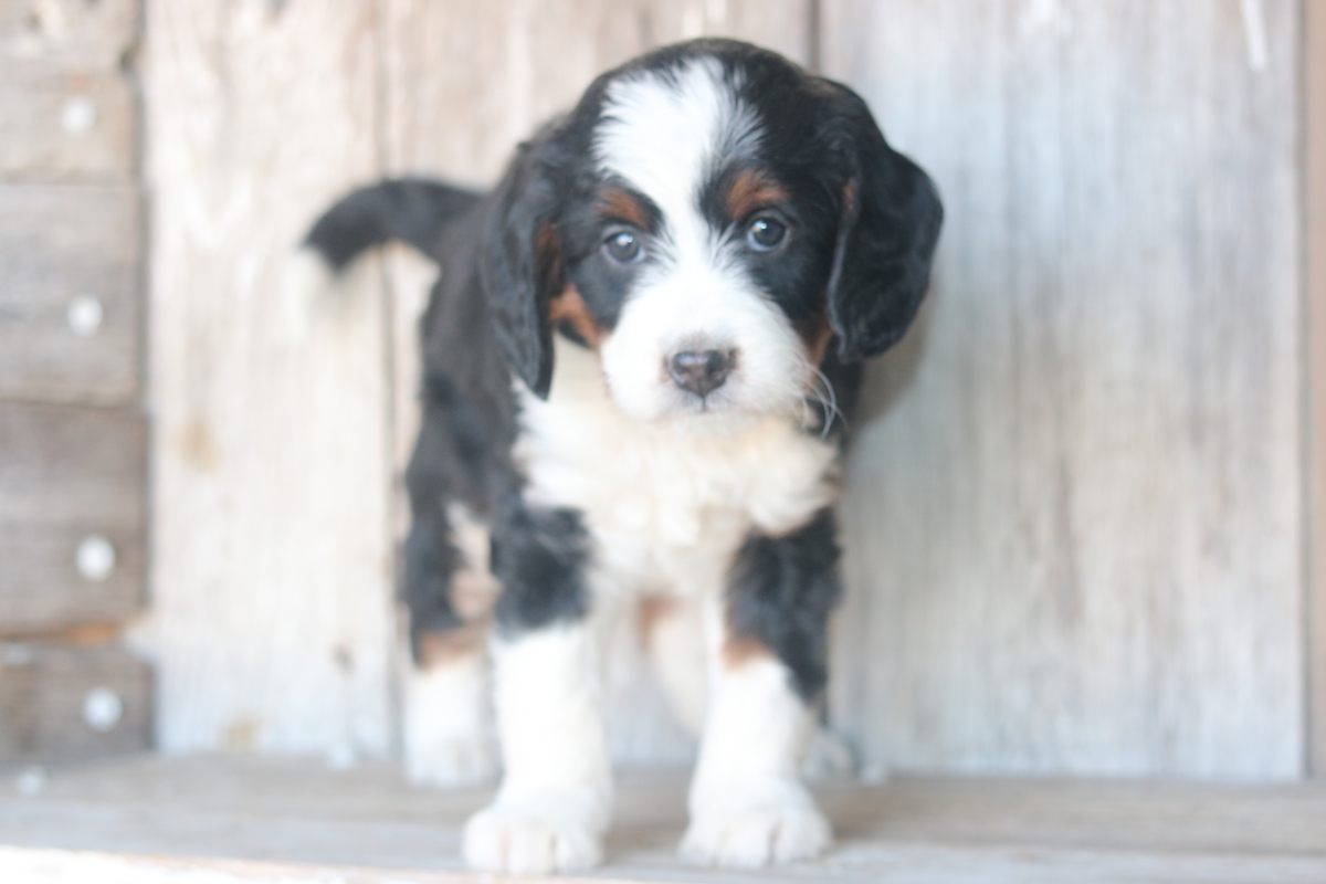 Lexo was born on 11/11/2025 to Sybil and Layne, he is a Black tri colored boy with tri colored markings. He is a F1 Mini Bernedoodle male that is expected to mature at approximately 30-50 pounds and have a heavy/wavy coat. Lexo has a medium disposition and weighs 5.13 pounds as of 12/21/25.