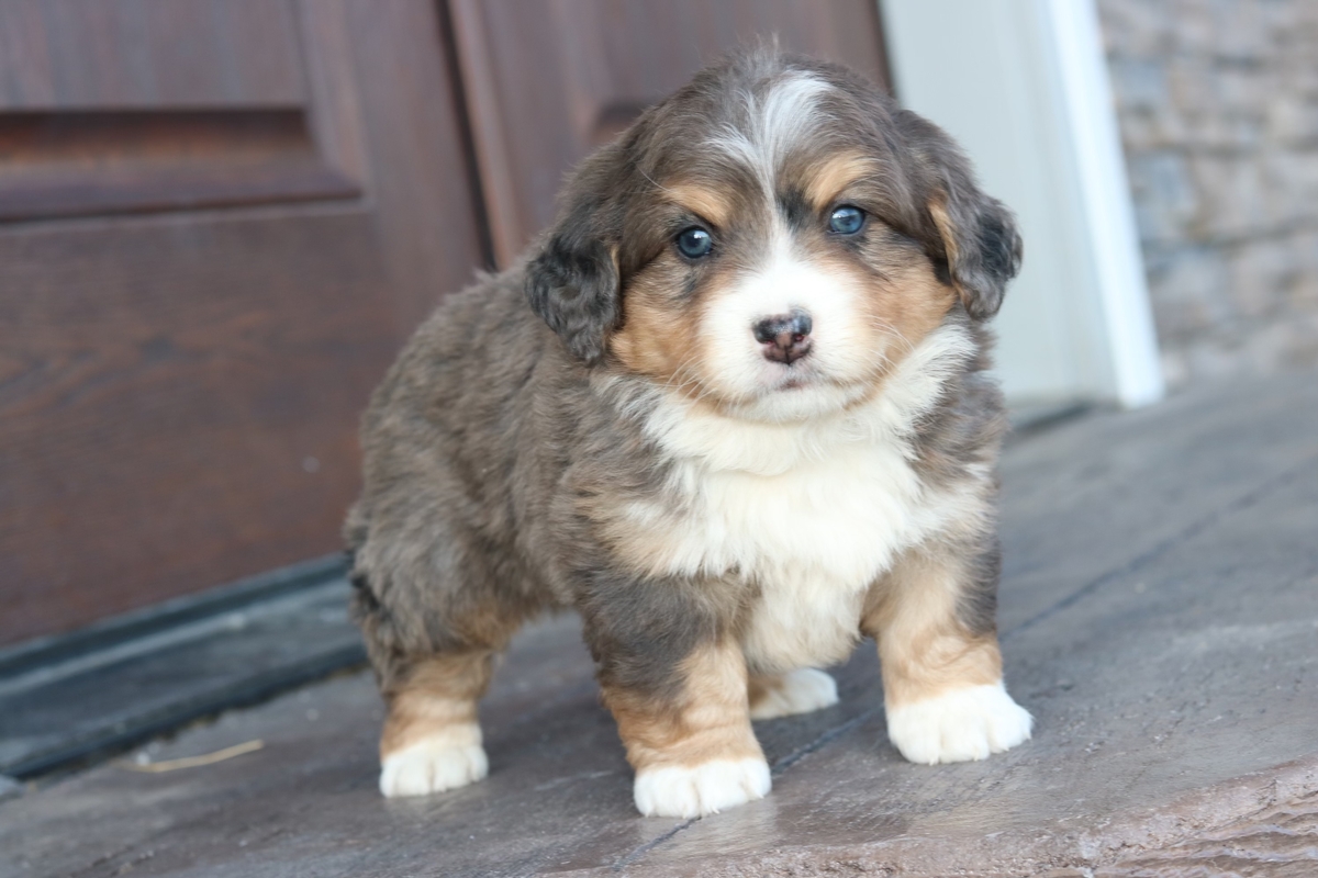 Liebster is a F1 Mini Bernedoodle weighing 4.4 pounds at 6 weeks old with an outgoing temperament. Liebster is a merle tri colored bernedoodle that is expected to mature at approximately 25-45 pounds and have a heavy/wavy coat.