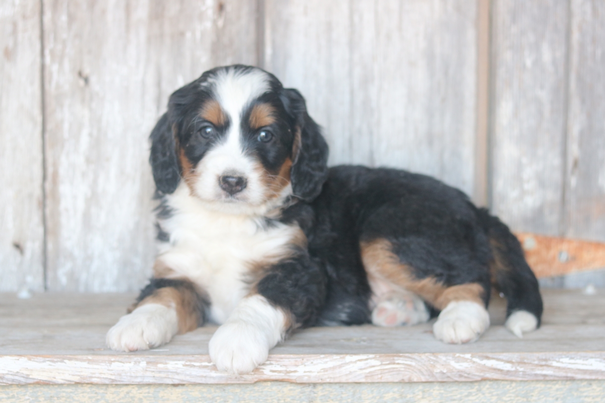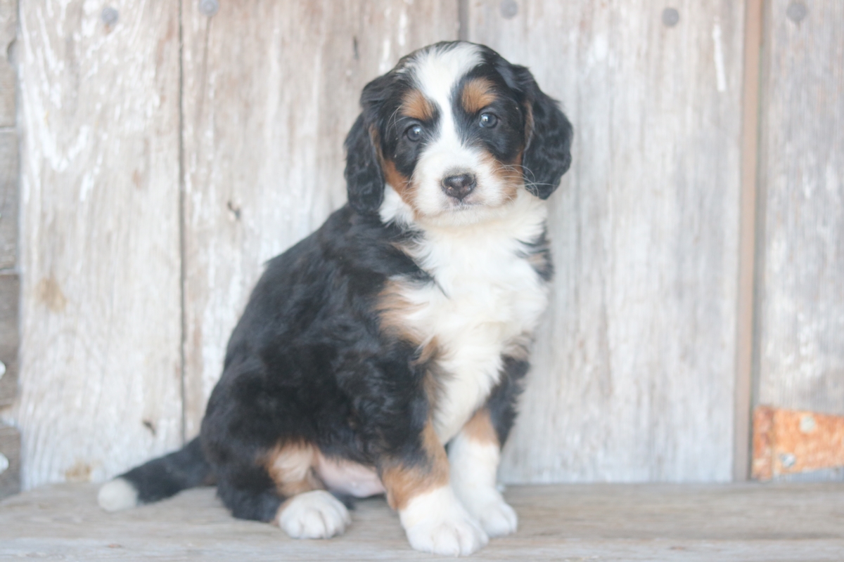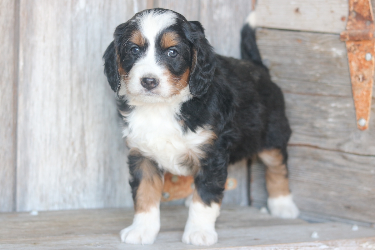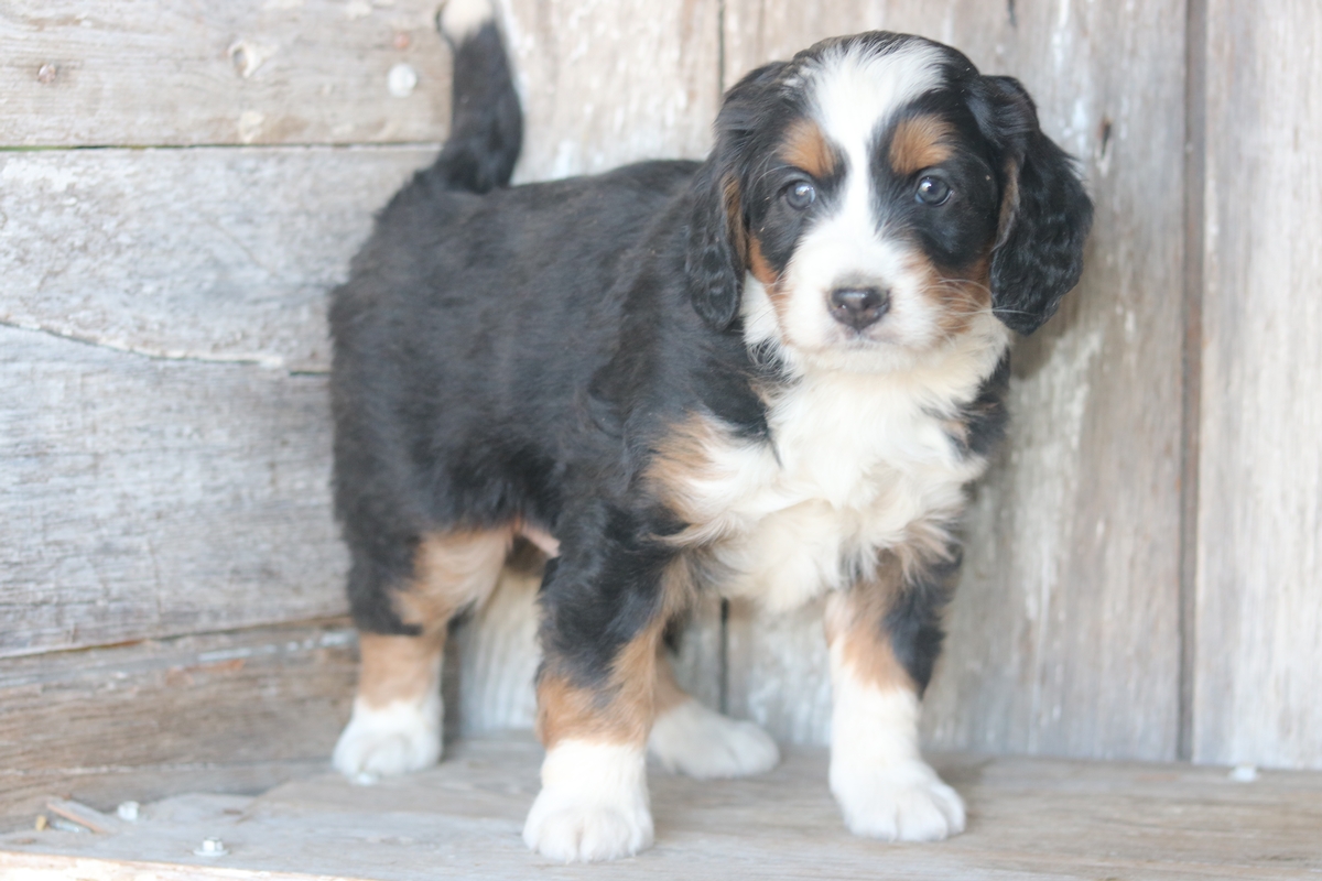 Linnartt was born on November the 11th to Sybil and Layne, he is a traditional black tri colored boy with traditional tri colored markings. He is a F1 Mini Bernedoodle male that is expected to mature at approximately 30-50 pounds and have a heavy/wavy coat. Linnartt has a medium disposition and weighs 5.8 pounds as of 12/21/2025.