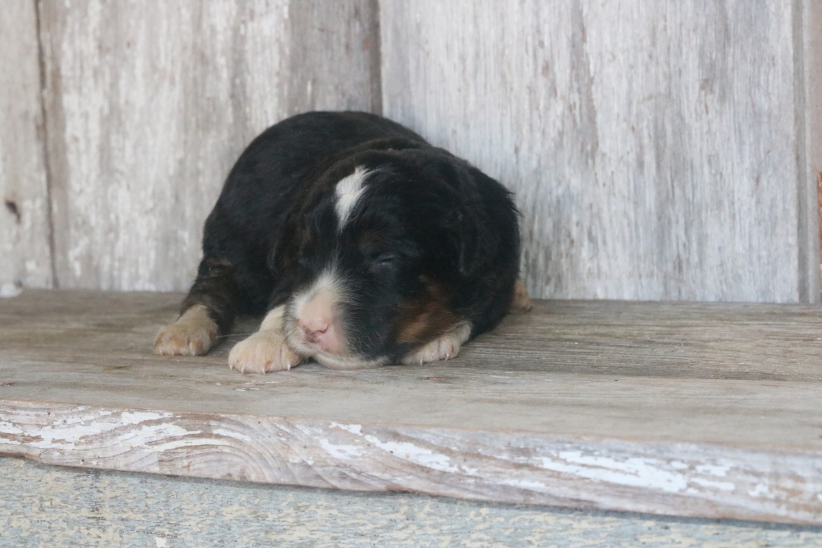 Linus was born to Sybil and Layne, he is a black tri colored boy with traditional tri colored markings. He is a F1 Mini Bernedoodle male that is expected to mature at approximately 30-50 pounds and have a heavy/wavy coat.