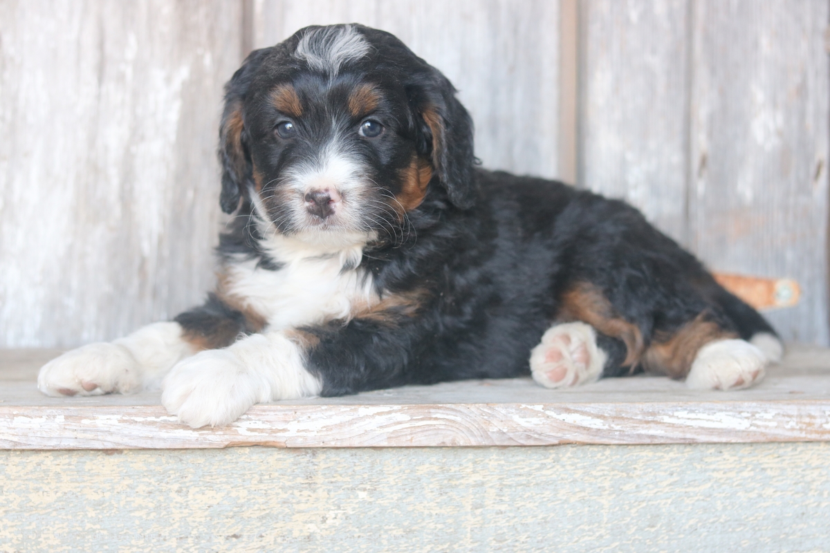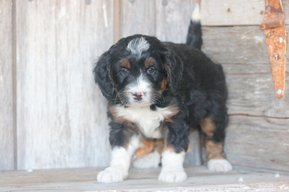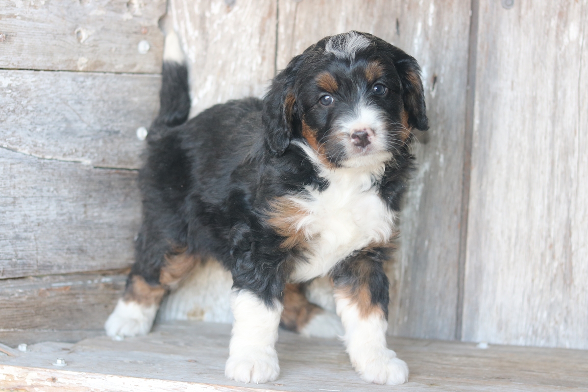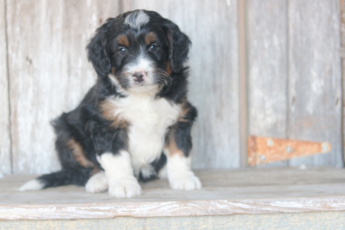 Linus was born to Sybil and Layne, he is a black tri colored boy with traditional tri colored markings. He is a F1 Mini Bernedoodle male that is expected to mature at approximately 30-50 pounds and have a heavy/wavy coat. Linus has an outgoing temperament and weighs 5.5 pounds as of December the 21st.