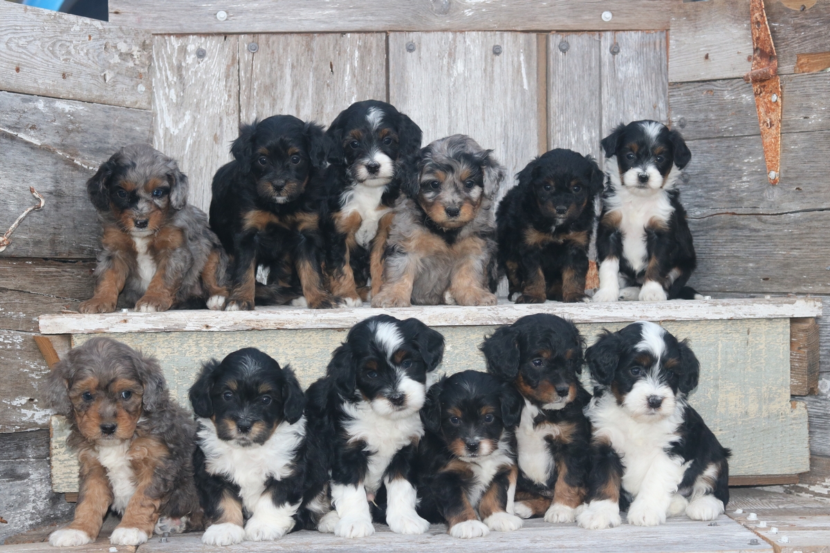 Tiny Bernedoodle puppies born on 8/21/2020 ( TAKE HOME OCTOBER 16) are 6 males and 6 females. These Bernedoodle puppies are a F1b Tiny Bernedoodles, Black Tri and Merle with traditional tri markings, These Micro Mini Bernedoodles are expected to mature to 15-30 pounds and parents are both genetically tested to ensure Health and Proper conformations.