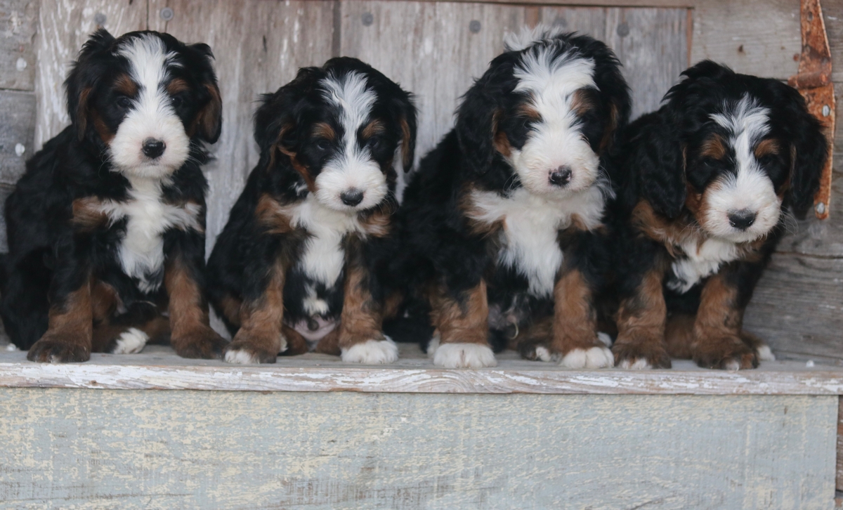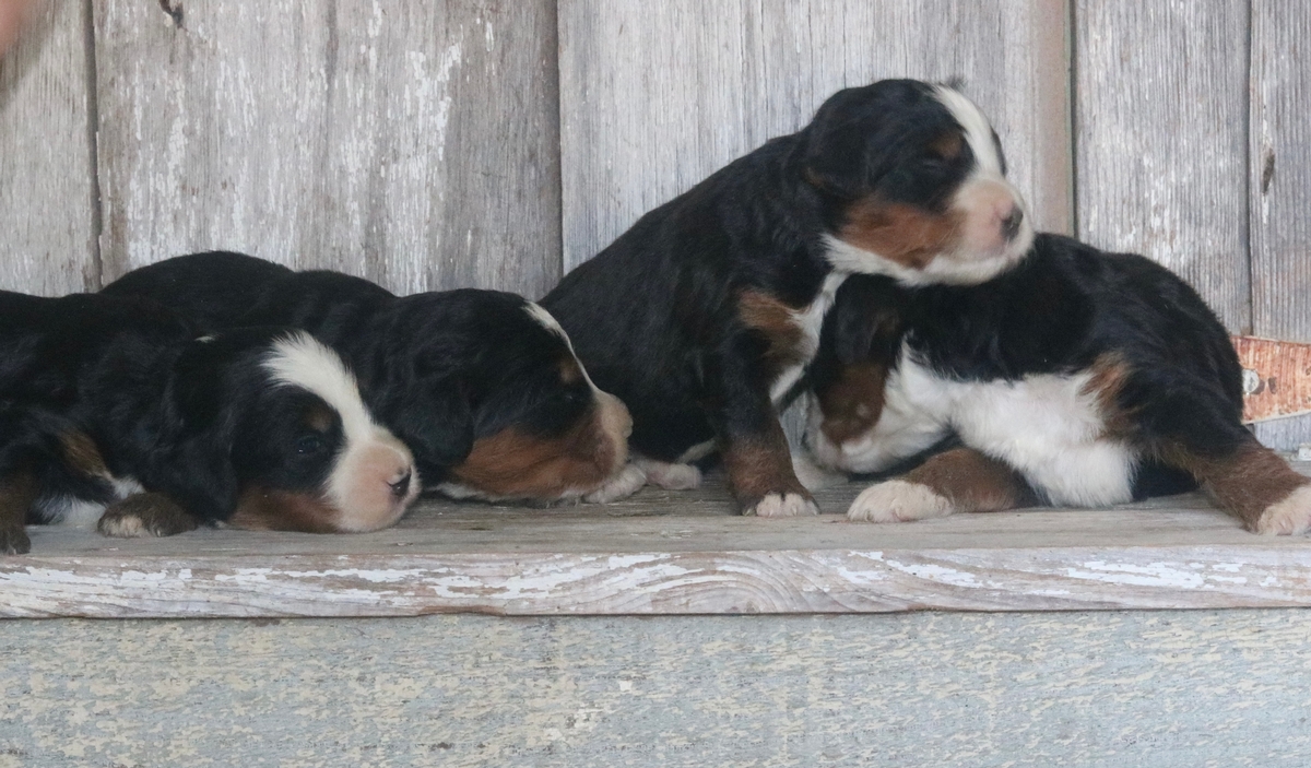 We are currently accepting deposits for this litter of F1 mini bernedoodle puppies born on November the 11th. They are expected to mature at approximately 30-50 pounds and will be ready to go home as soon as January the 6th, being the earliest. There are 4 beautiful males in this litter out of Maple and Ariat.