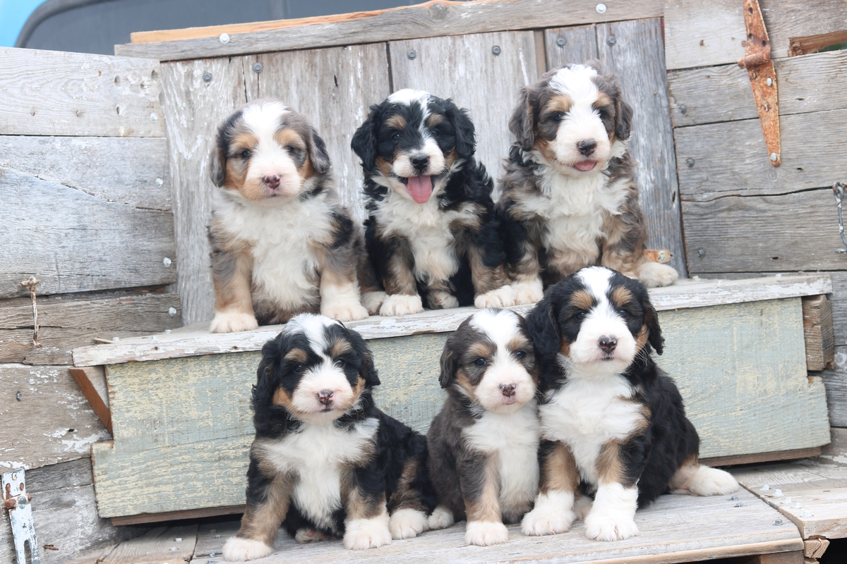 These first generation Mini Bernedoodle puppies were born to Mia and Bentley, on 7/1/2022 are 3 males and 3 females. These F1 Mini Bernedoodles are expected to mature to 30-50 pounds and both parents are genetically tested to ensure maximum potential of having a wavey and minimal shedding coat.