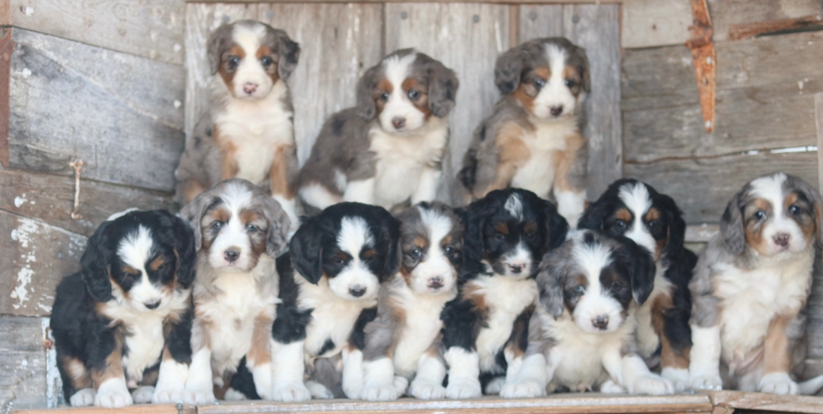 Born 11/11/2025 are 8 males and 3 females to Sybil and Layne. These Bernedoodle puppies are a F1 Mini Bernedoodle, there are Merle Tri Colored puppies and Black Tri colored puppies in this litter. These First Generation Bernedoodles are expected to mature at approximately 30-50 pounds and have heavy-wavy coats. These Bernedoodle puppies can go home by January the 6th being the earliest.