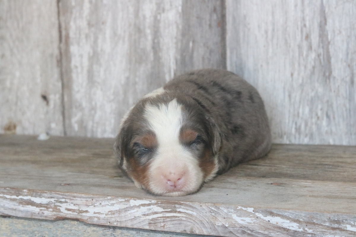 Loona is a F1 Mini Bernedoodle girl that is expected to mature at approximately 30-50 pounds that was born to Sybil and Layne on November the 11th. She will have a Heavy-Wavey Merle colored coat with tri colored markings.