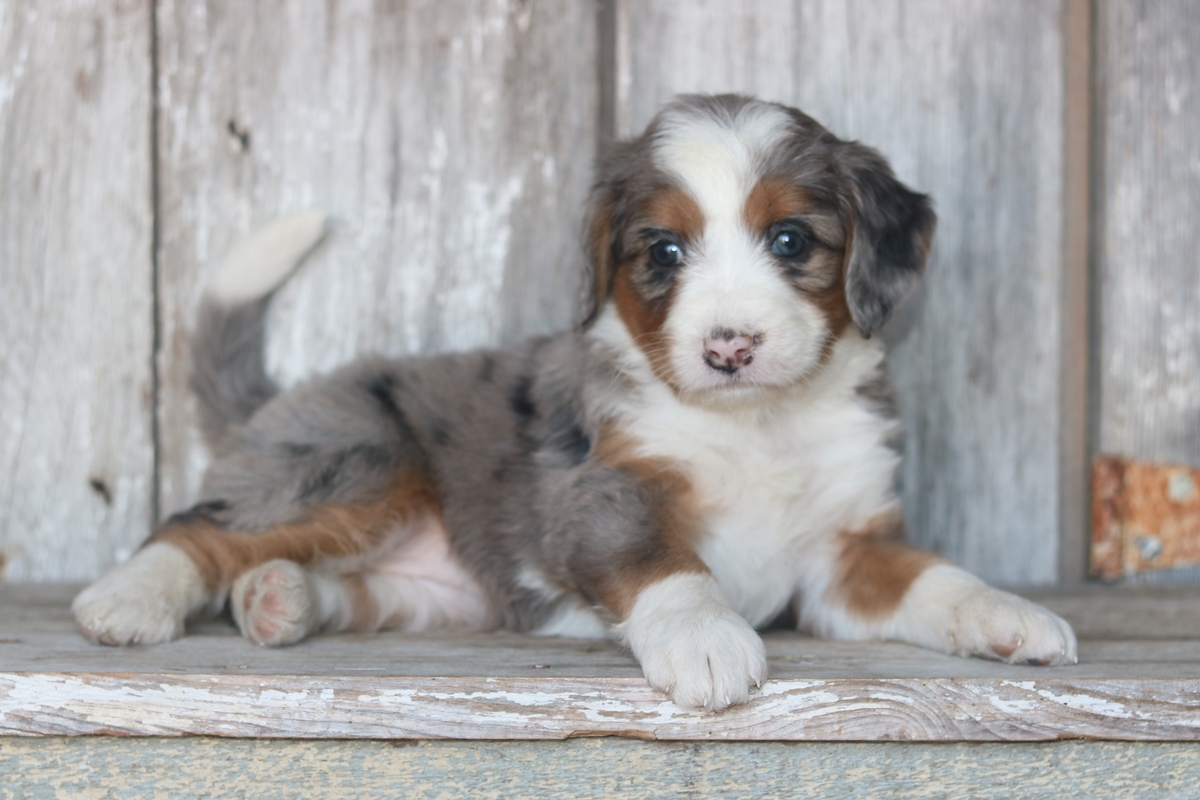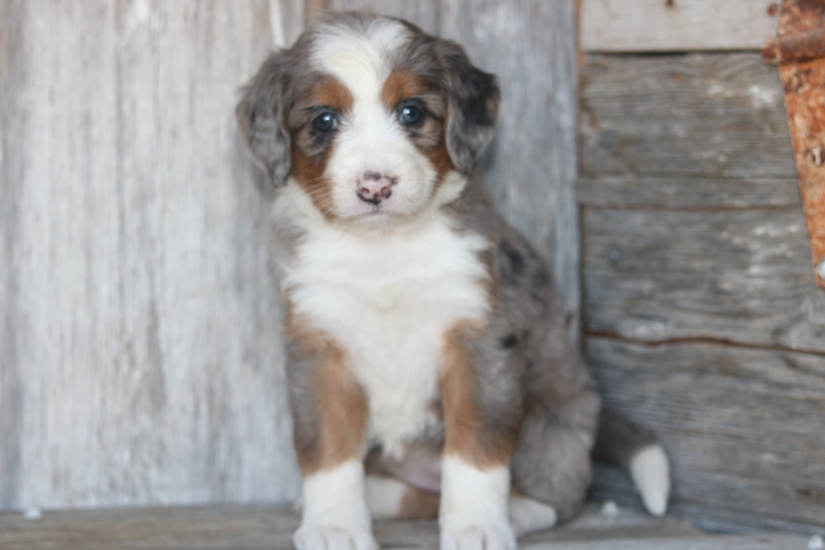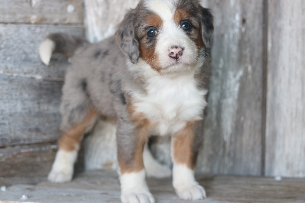 Loona is a F1 Mini Bernedoodle girl that is expected to mature at approximately 30-50 pounds that was born to Sybil and Layne on November the 11th. She will have a Heavy-Wavey Merle colored coat with tri colored markings. Loona has a medium disposition and weighs 4.12 pounds as of 12/21/25.