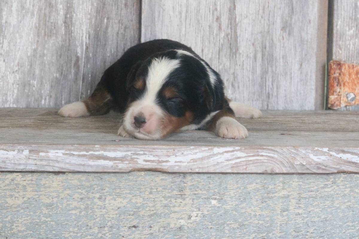 Lucio was born on 11/11/2025 to Sybil and Layne, he is a black tri colored boy with traditional tri colored markings. He is a F1 Mini Bernedoodle male that is expected to mature at approximately 30-50 pounds and have a heavy/wavy coat.