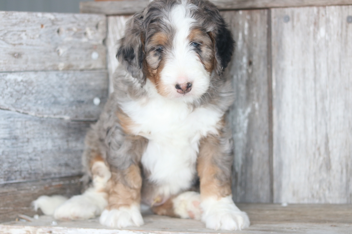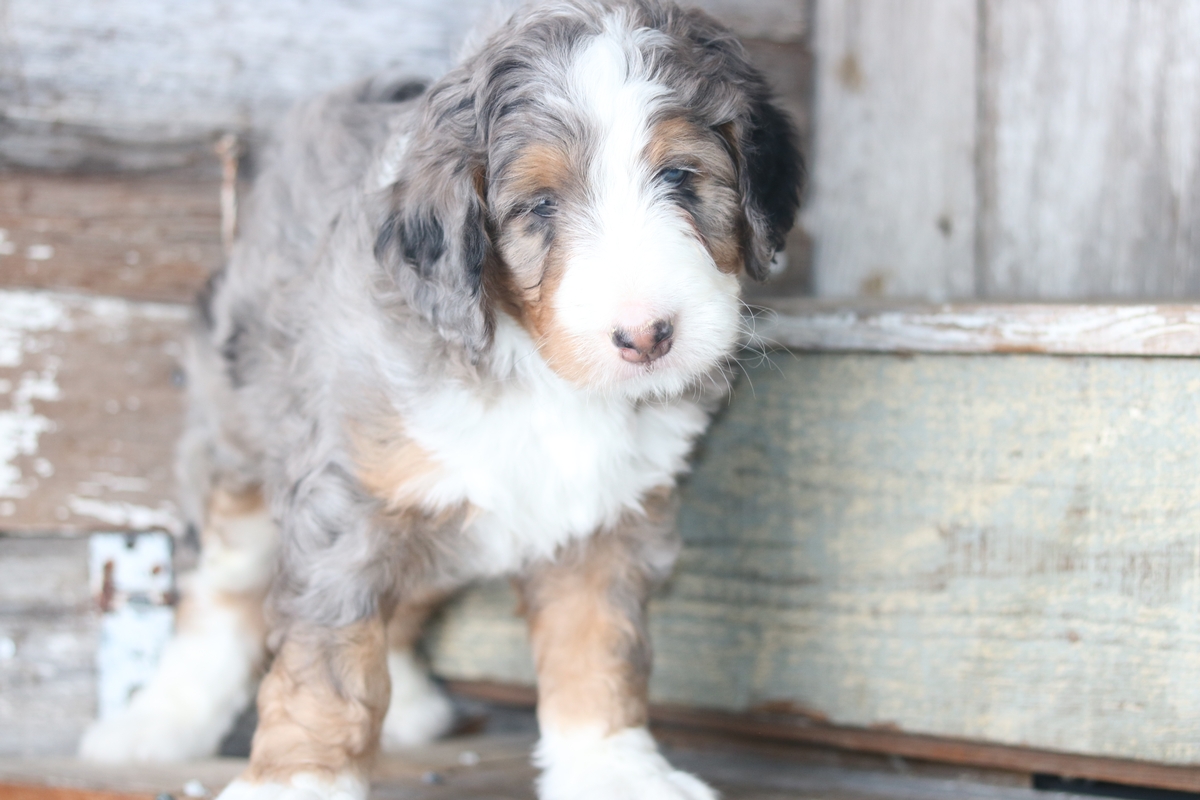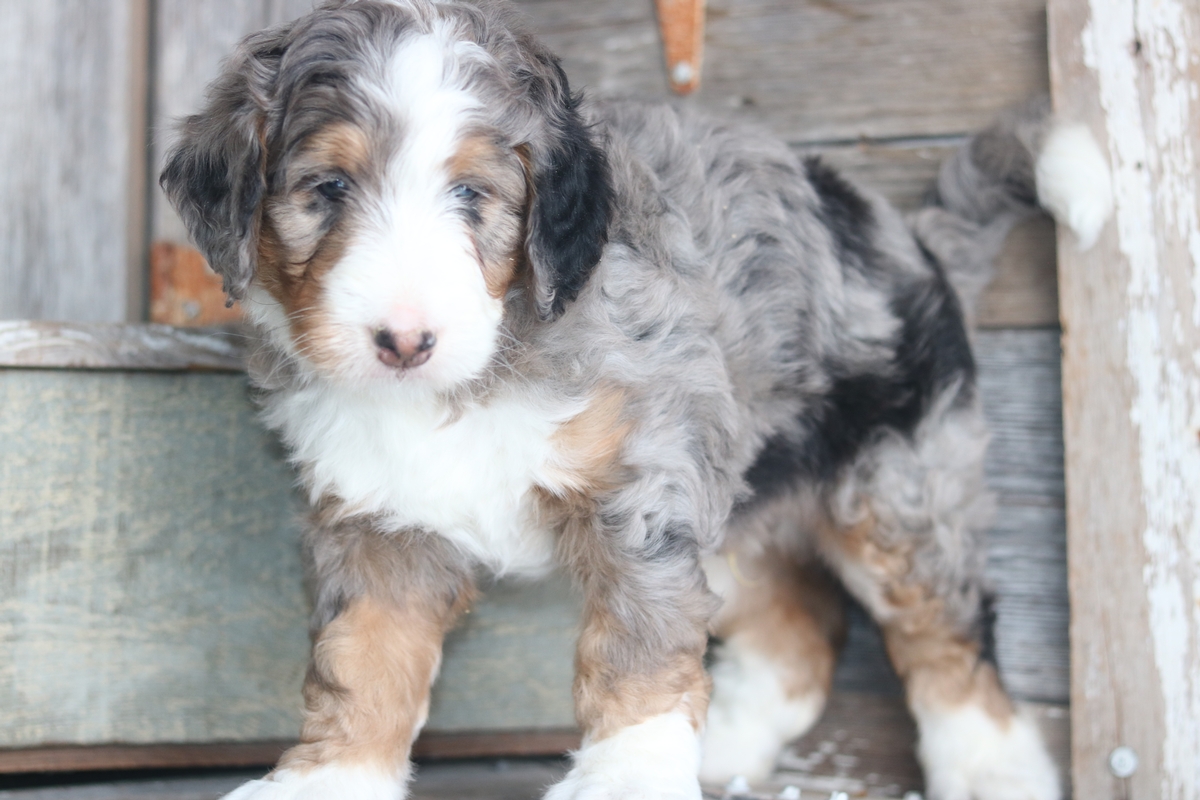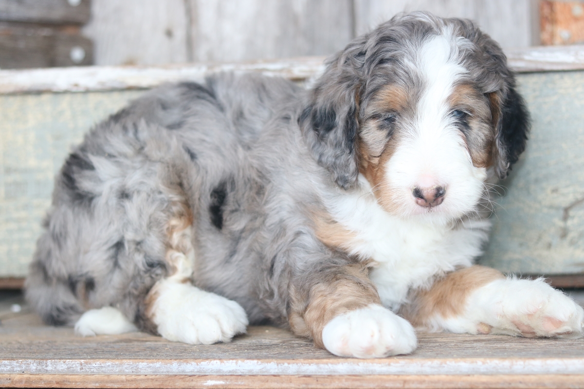 Born to Friska and Teddy on December the 19th is Macos, he is a Merle colored male with tri colored markings. He is expected to mature at approximately 60-80 pounds and have a heavy wavy coat. Macos weighs 12 pounds at almost 6 weeks old and has a medium disposition based off his litter.