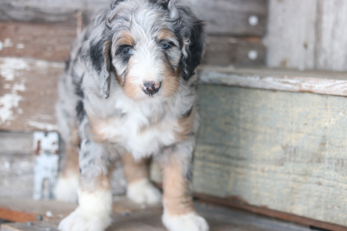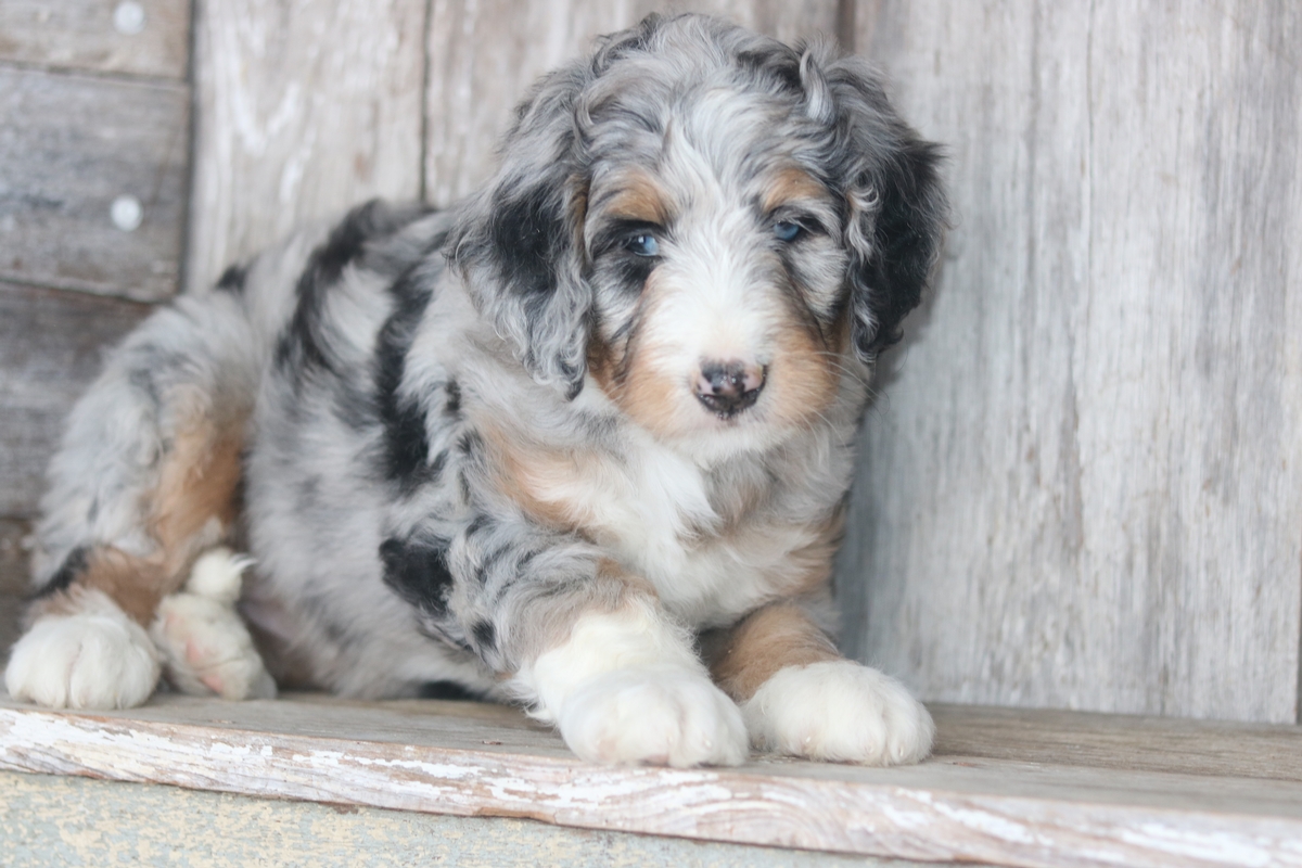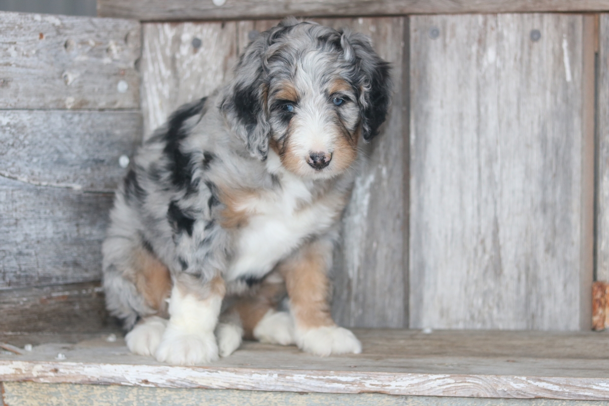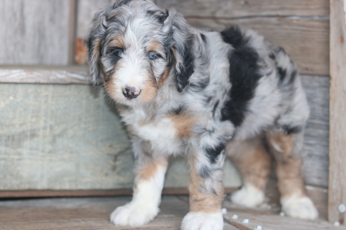 Mamie was born on December the 19th to Friska and Teddy, she is a Merle colored female with Tri colored markings and is expected to mature at approximately 60-80 pounds and have a heavy wavy coat. Mamie weighs 9.3 as of 1/29/2026 and has an outgoing disposition.