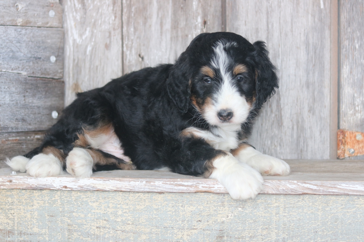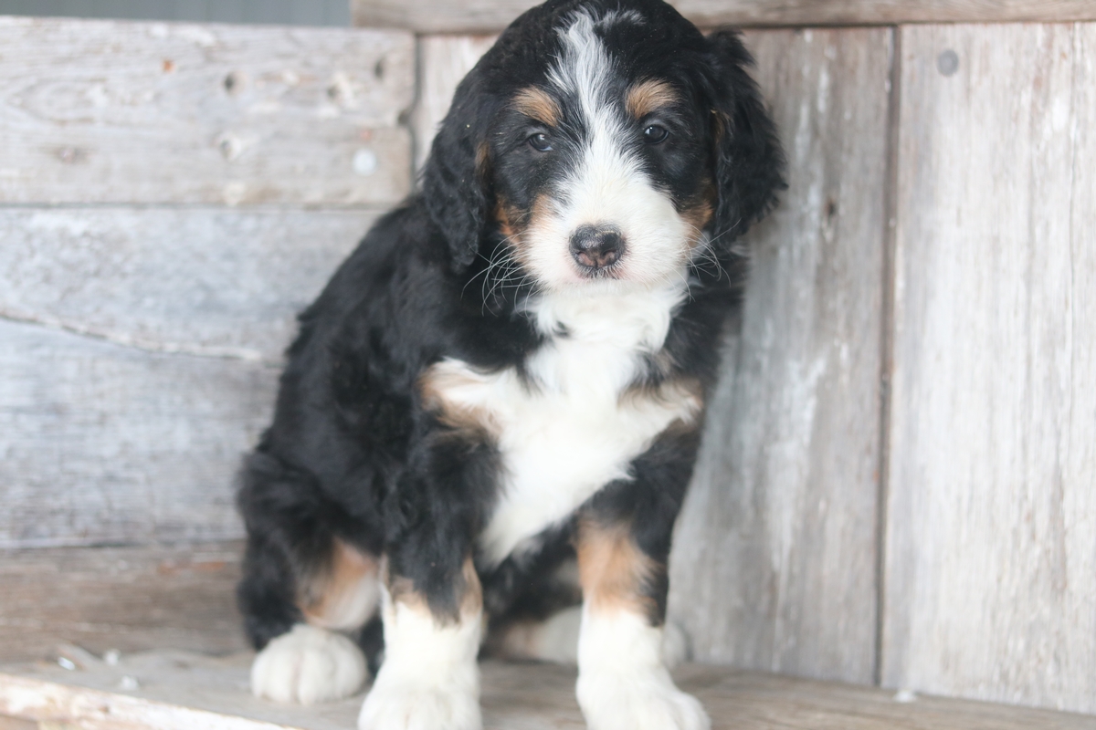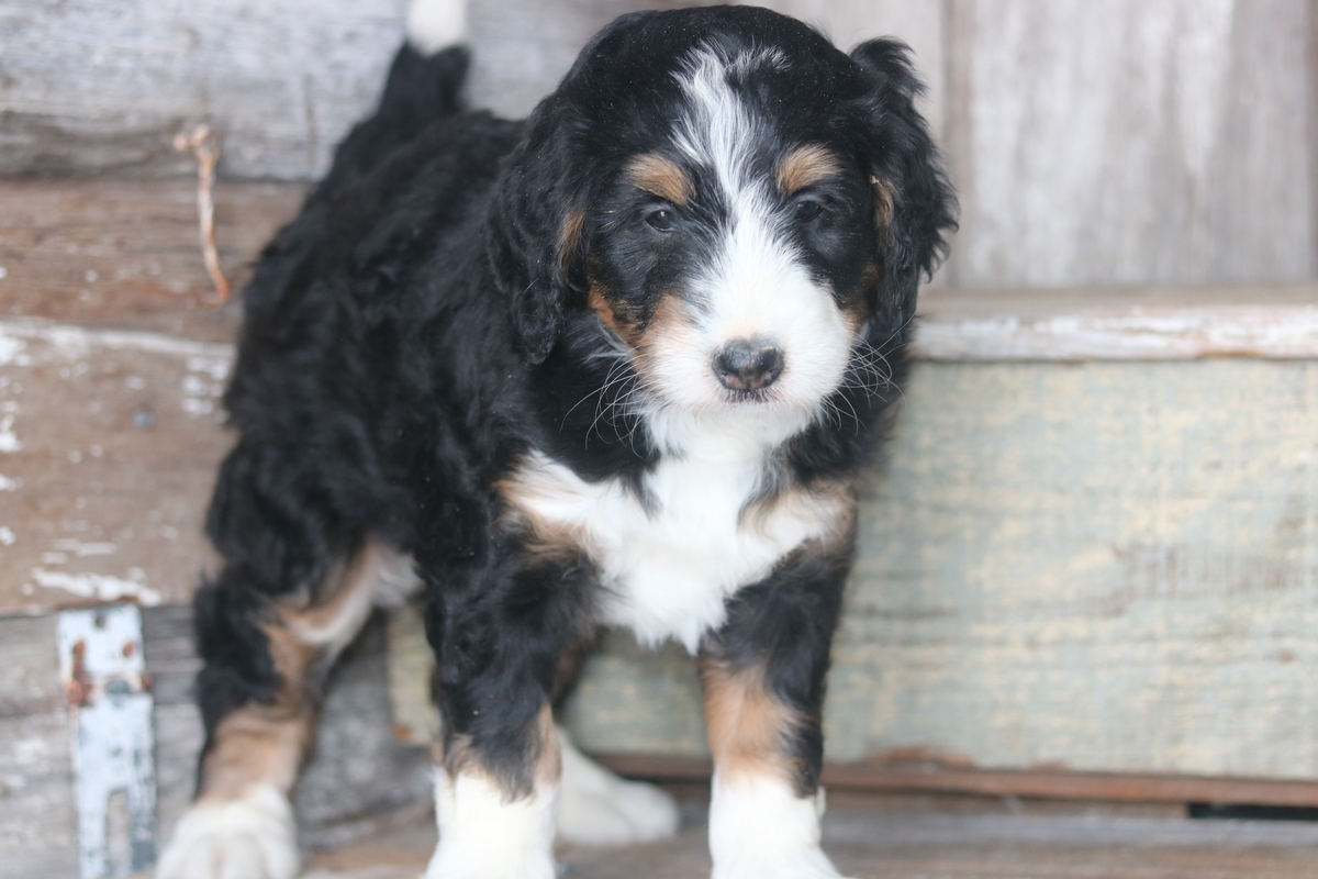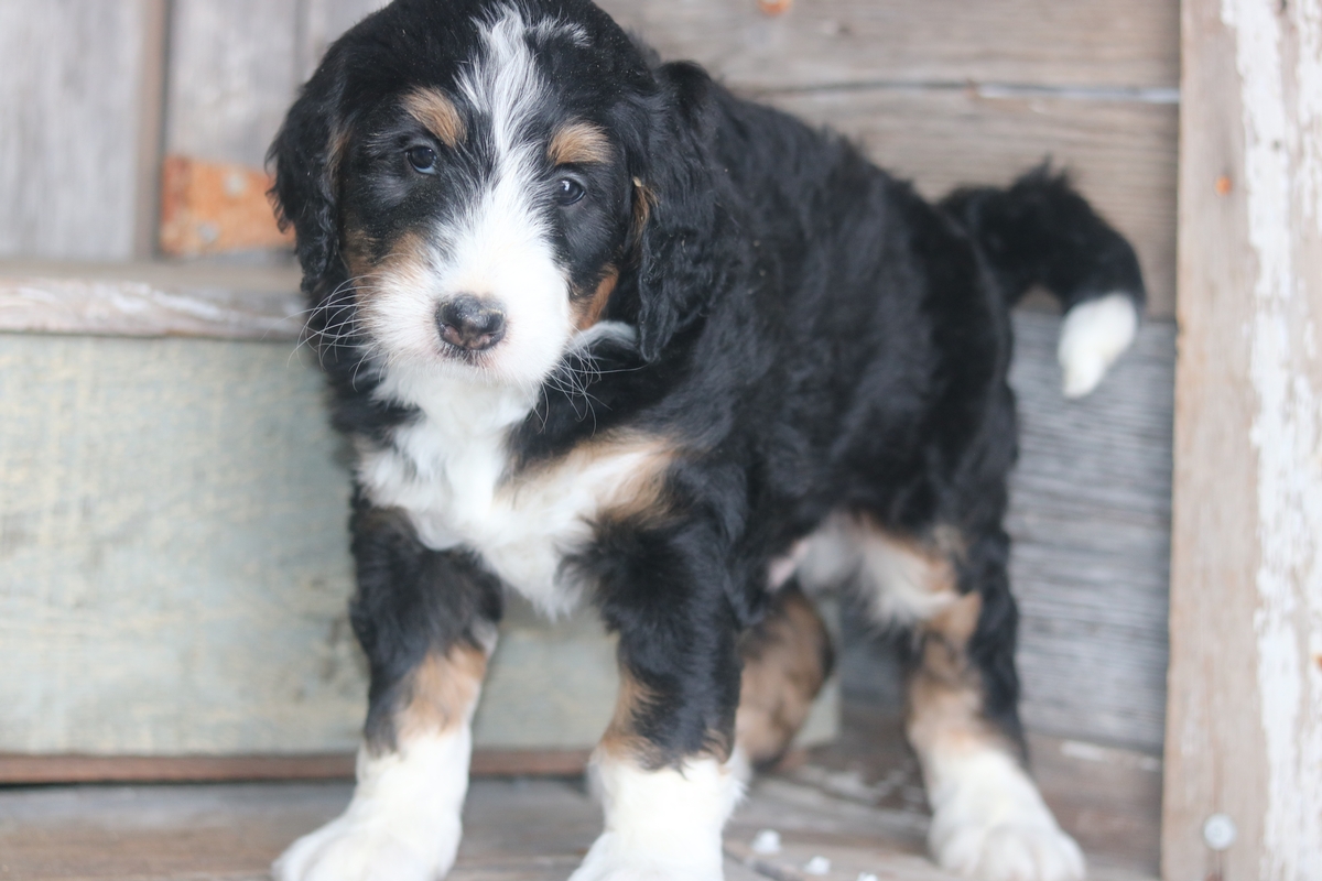 Born to Friska and Teddy is Marek, he is a Black Tri colored boy with traditional tri colored markings and is expected to mature at approximately 60-80 pounds and have a heavy wavy coat. Marek has a laidback disposition and weighs 10.5 pounds as of 1/29/26.