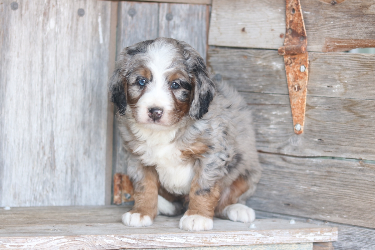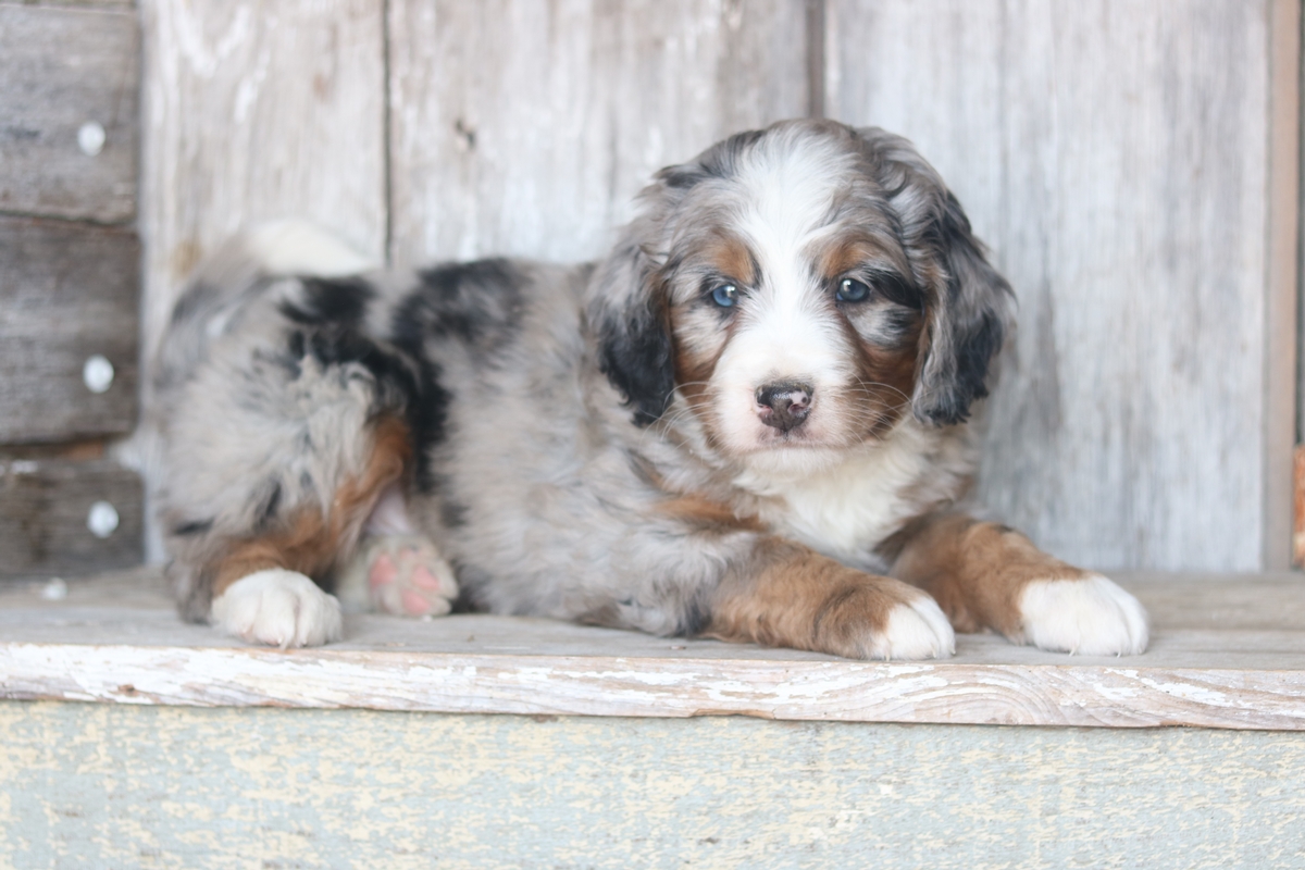 Neleo is a F1 Mini Bernedoodle male that is expected to mature at approximately 35-55 pounds and have a Heavy-Wavey Merle colored coat with tri markings. Neleo weighs 6.11 pounds as of 2/5/2026 and has a laidback disposition.