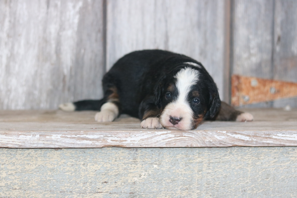Nera is a F1 Mini Bernedoodle boy that is expected to mature at approximately 35-55 pounds that was born to Bella and Bentley on 12/24/25. He will have a Heavy-Wavey Black Tri colored coat with traditional tri colored markings.