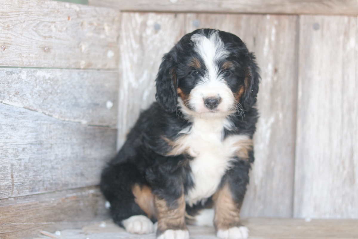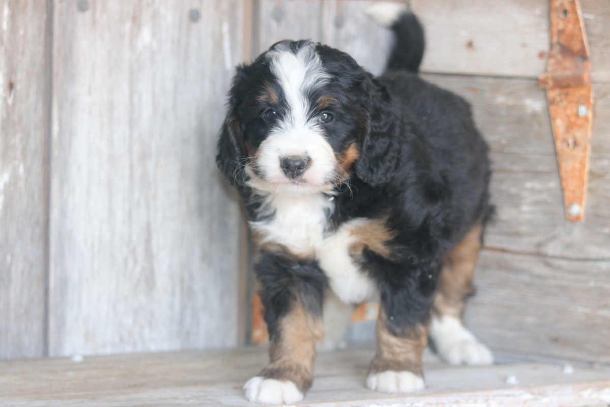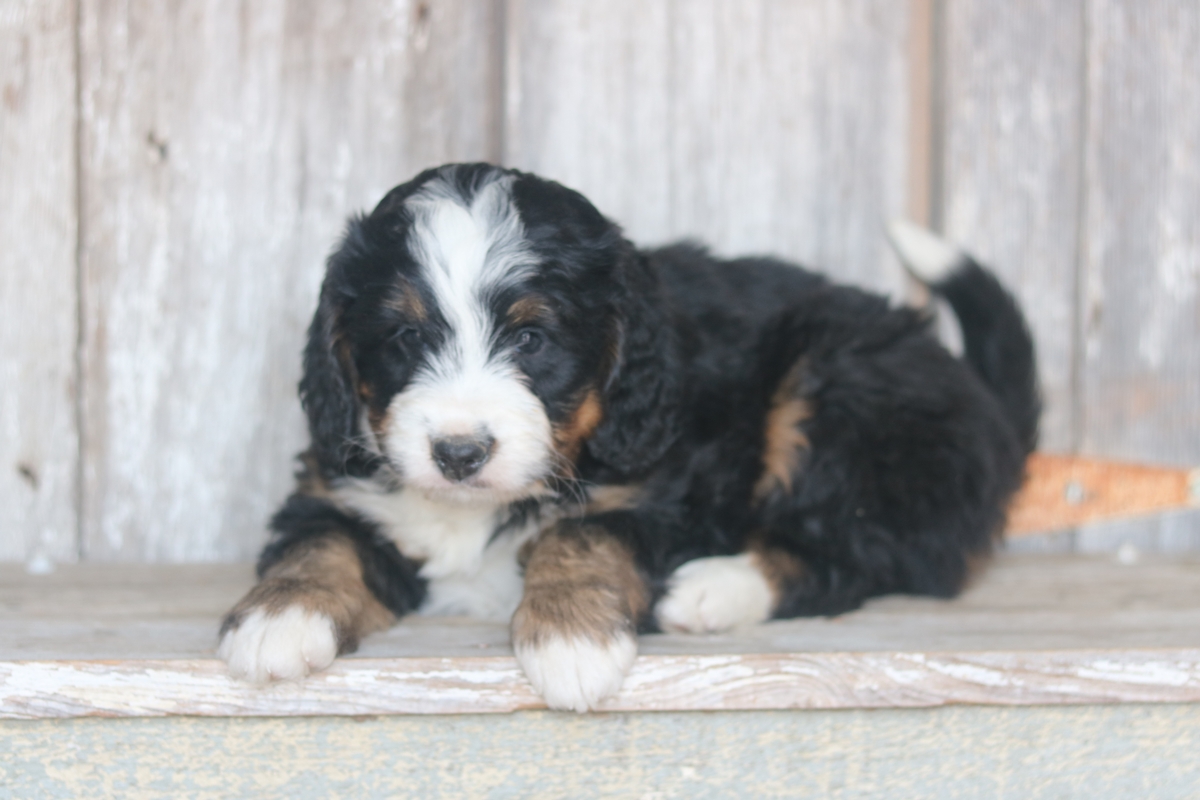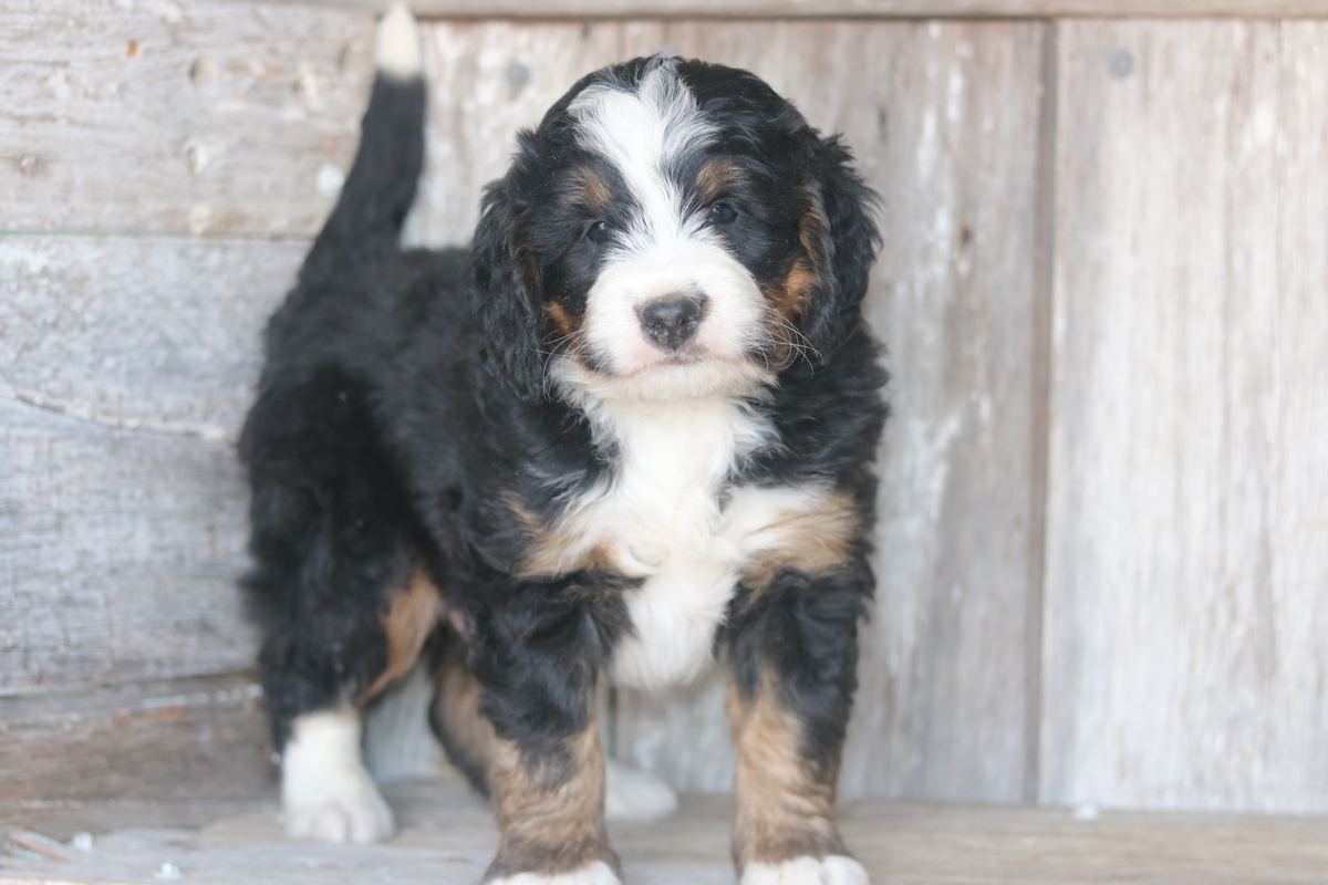 Nera is a F1 Mini Bernedoodle boy that is expected to mature at approximately 35-55 pounds that was born to Bella and Bentley on 12/24/25. He will have a Heavy-Wavey Black Tri colored coat with traditional tri colored markings. Nera weighs 6.12 pounds at 6 weeks old and is rated as having a medium disposition.
