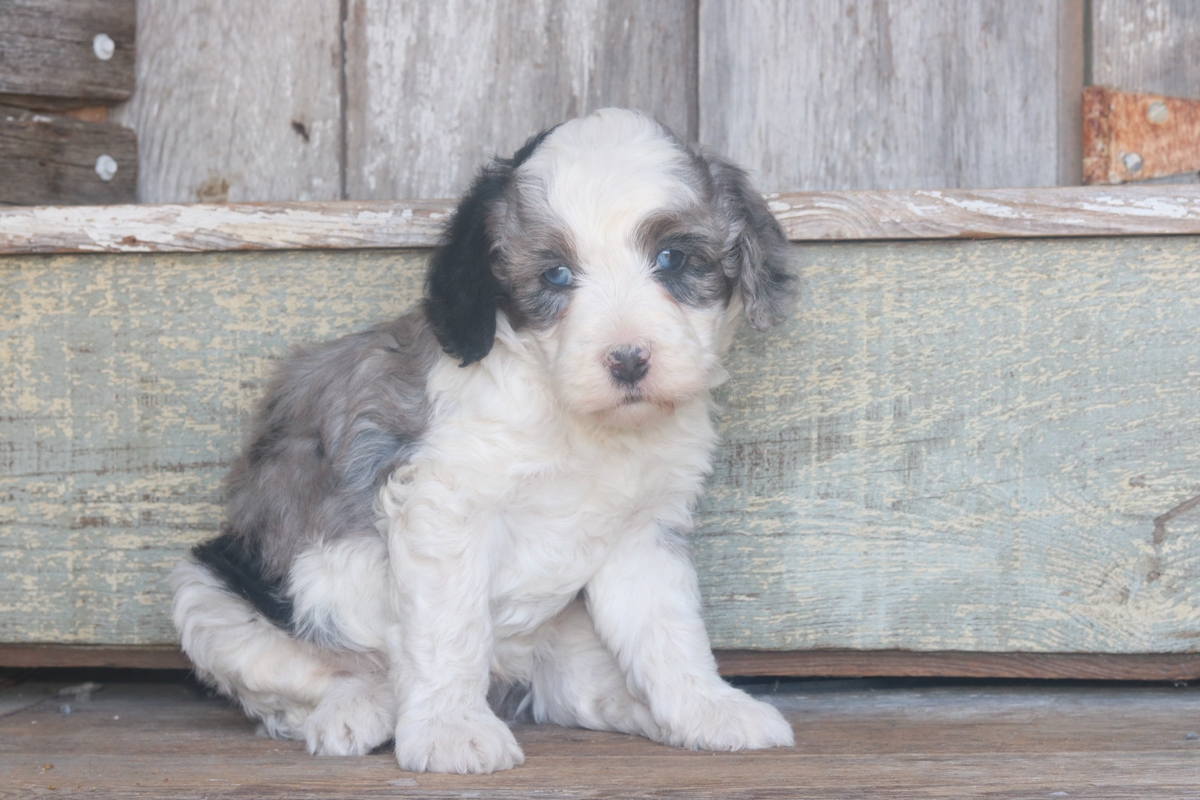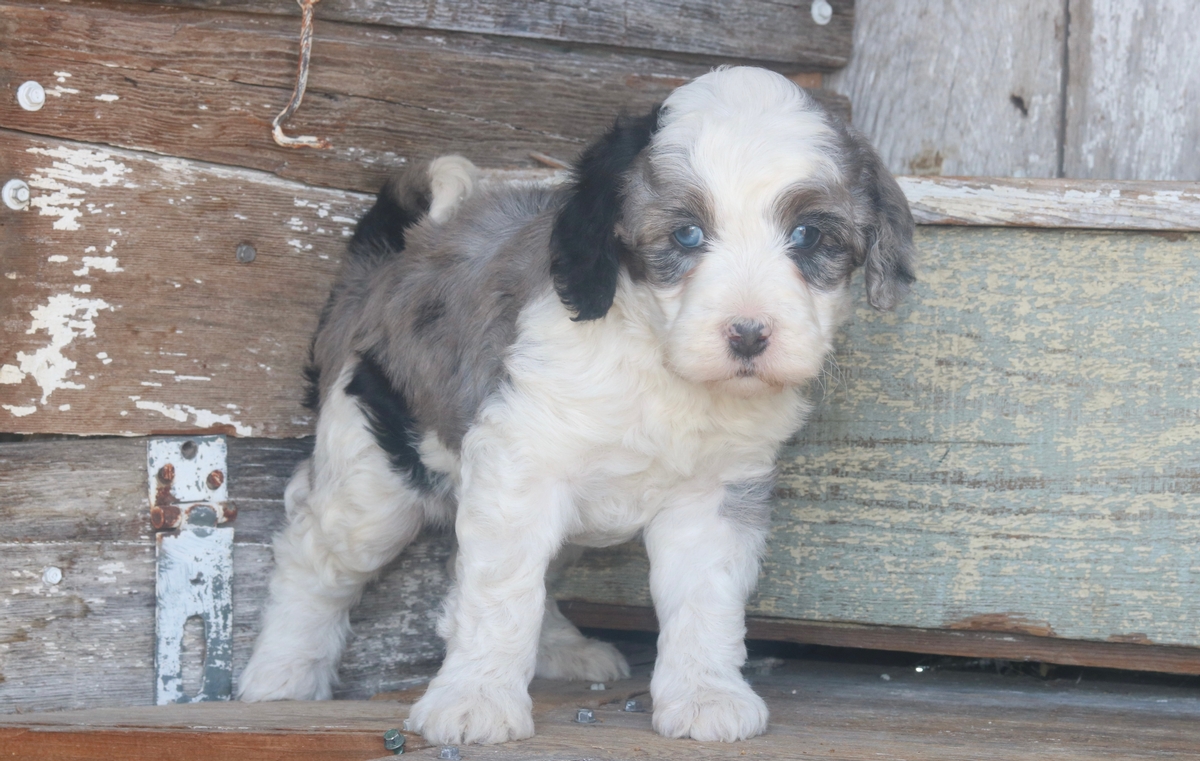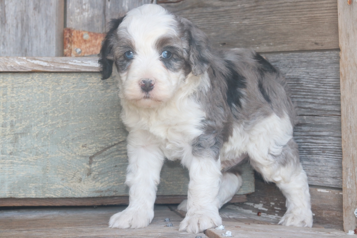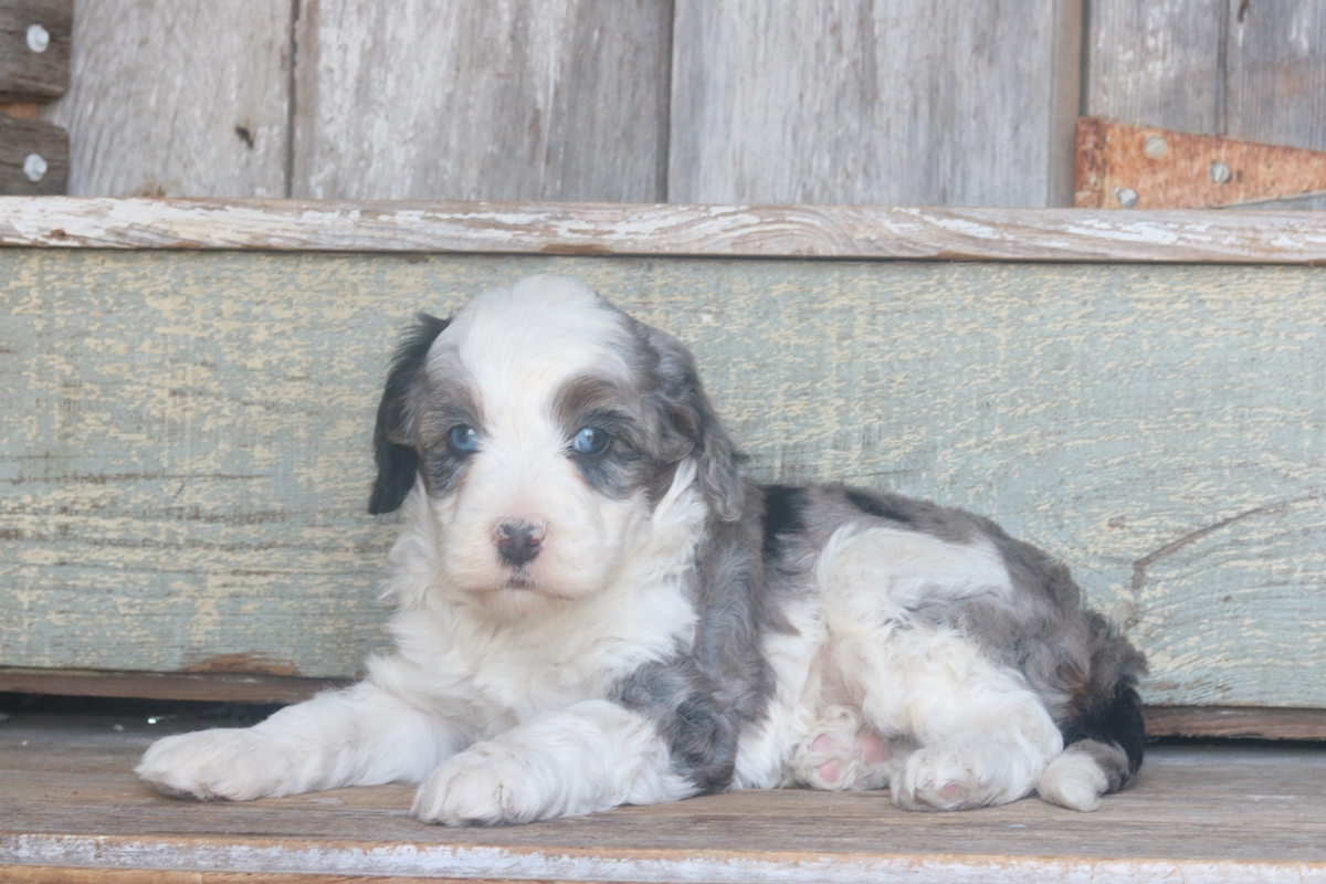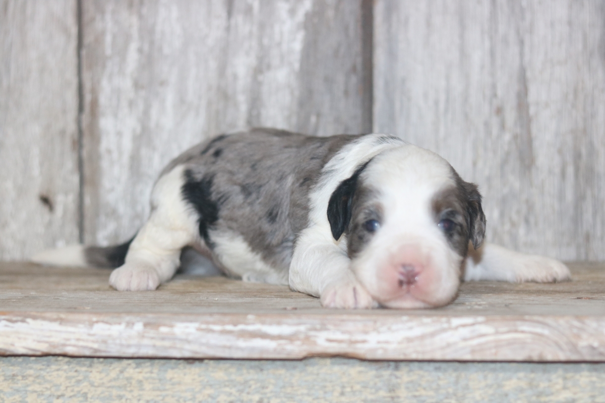 Obelix, a Merle F1b Micro Mini Bernedoodle with beautiful tri-colored markings, was born on February 3rd, to Remi and Layne. He is expected to reach a mature weight of around 15–30 pounds and will have a heavy-wavy coat. Obelix is weighing 4.13 pounds as of 3/14/26 and is rated as having an outgoing disposition based off his litter.