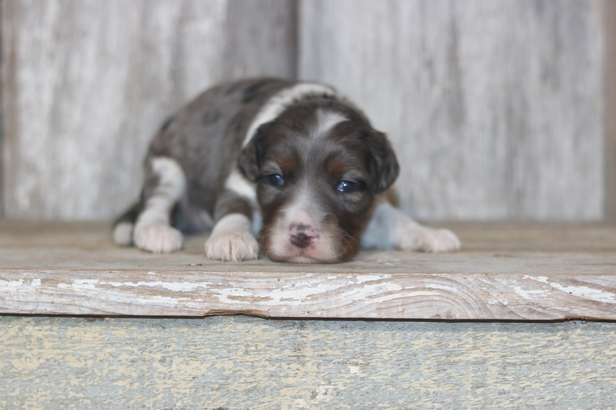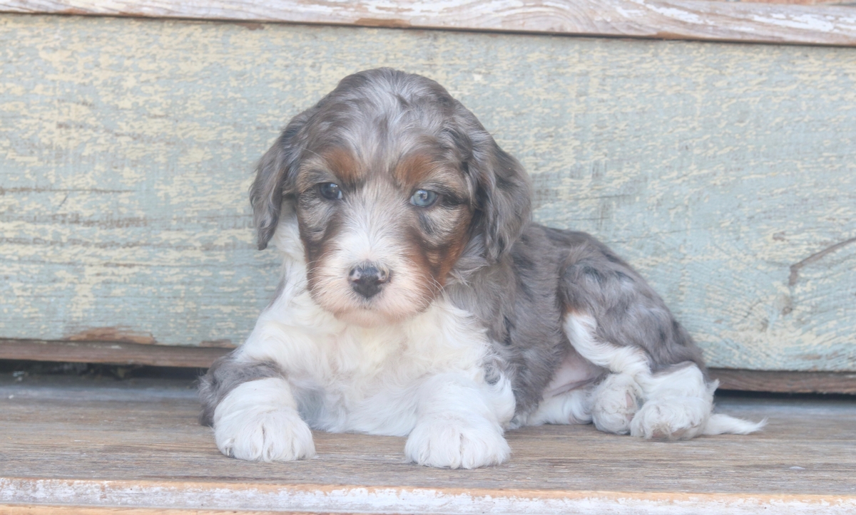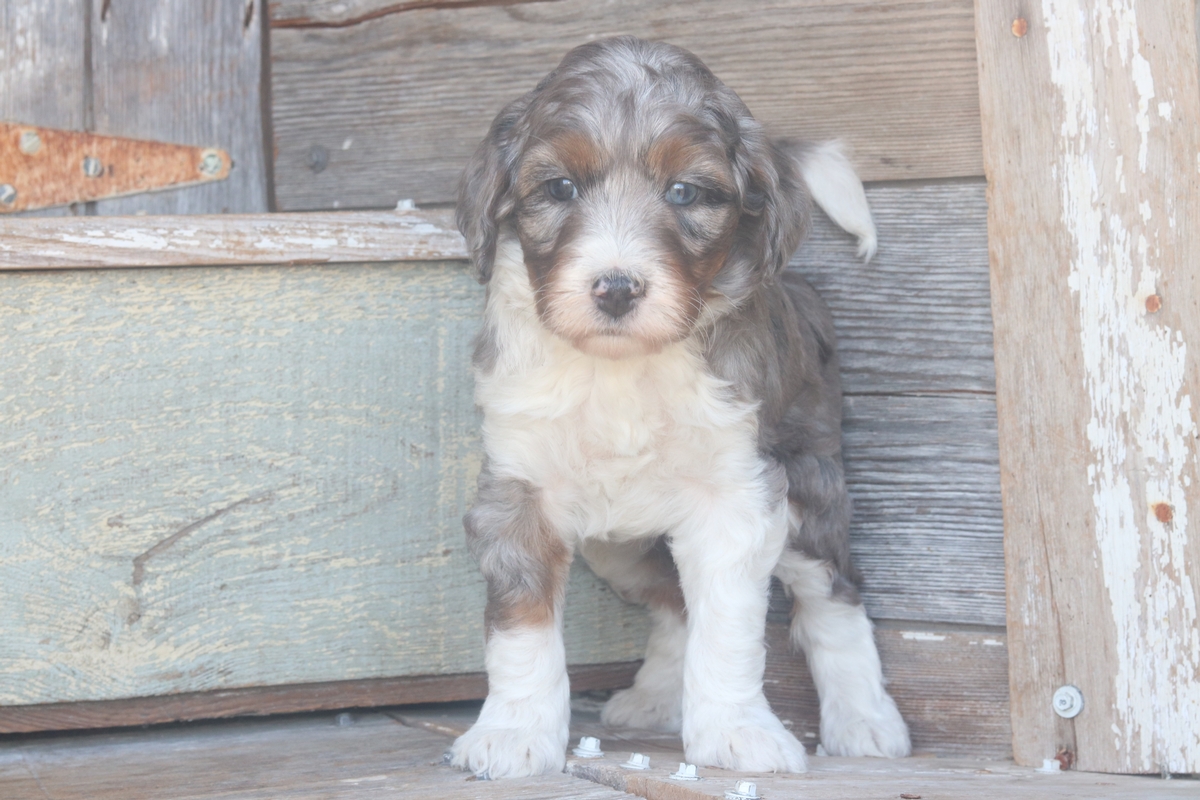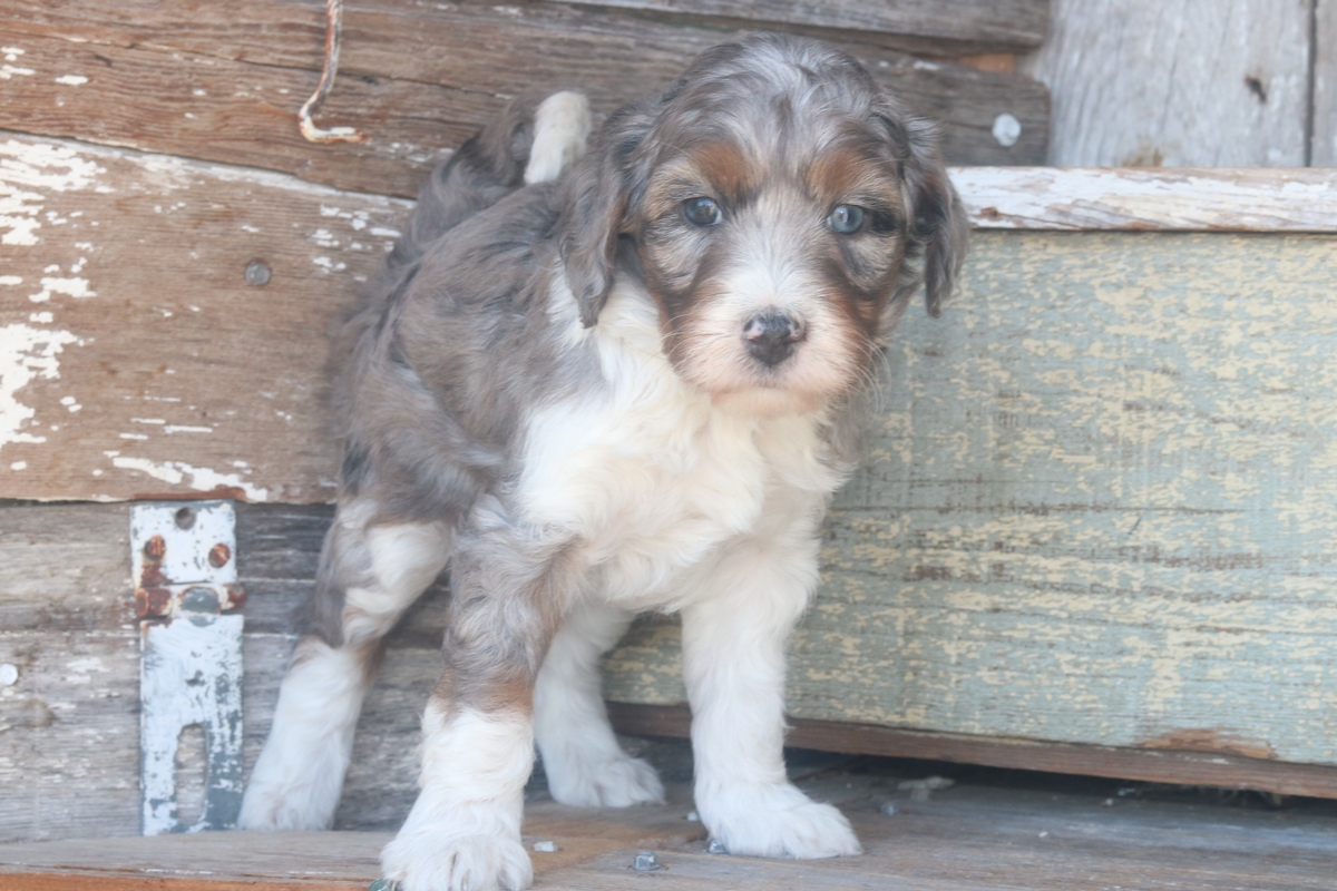 Occia, a Merle F1b Micro Mini Bernedoodle girl with tri-colored markings, she was born on February 3rd, to Remi and Layne. She is expected to reach a mature weight of around 15–30 pounds and will have a heavy-wavy coat. Occia weighs 4.1 pounds and has a medium disposition.