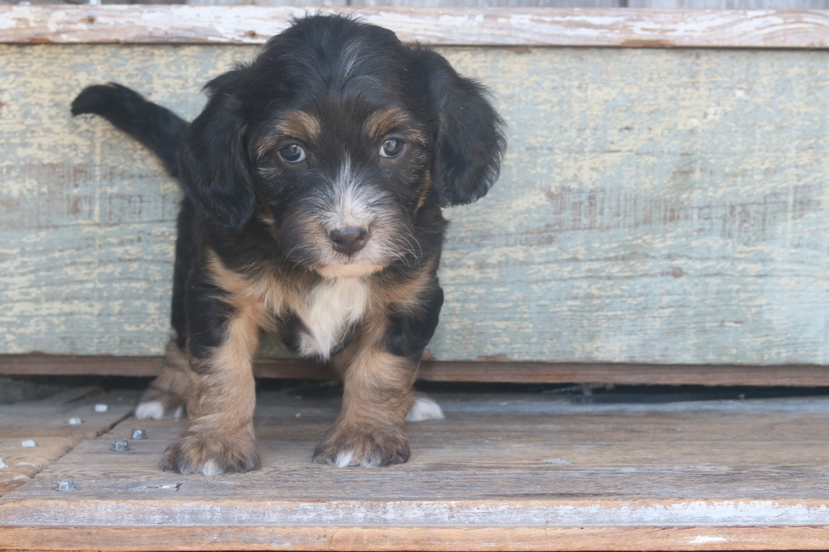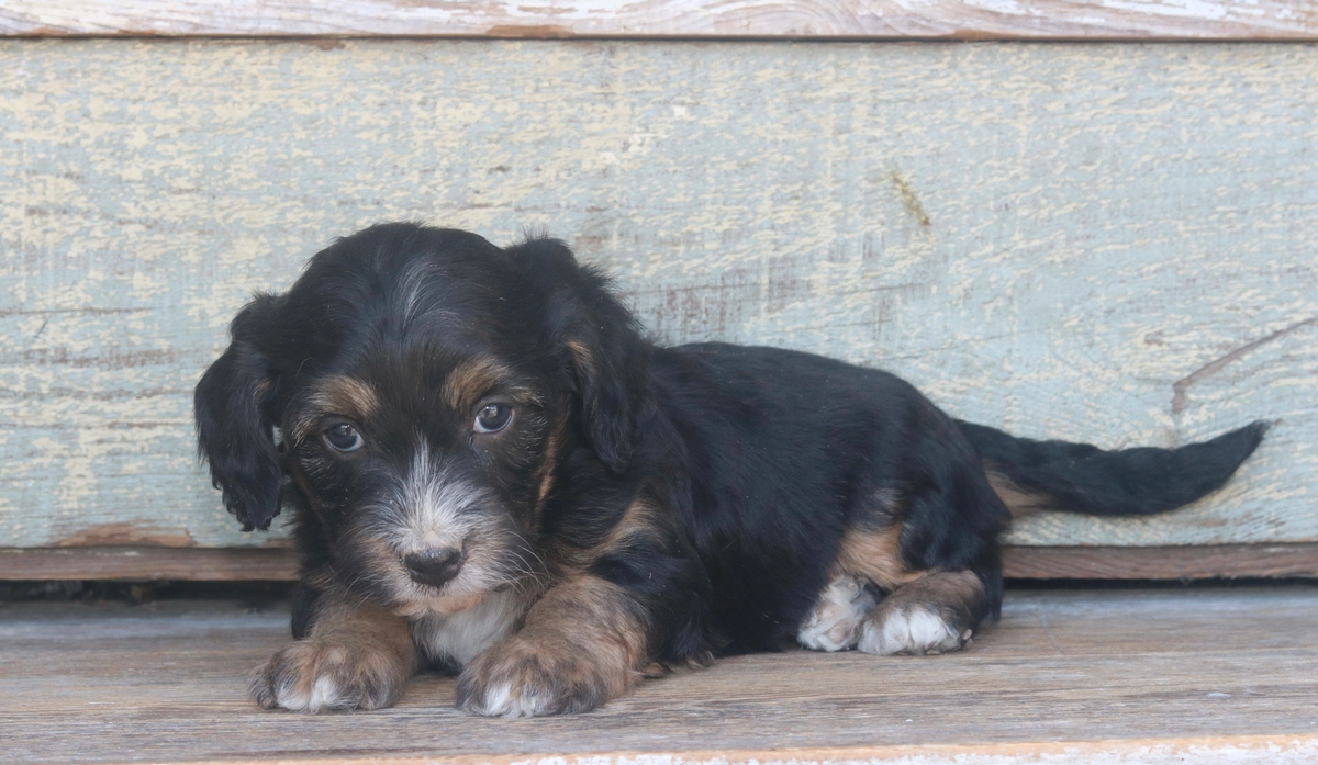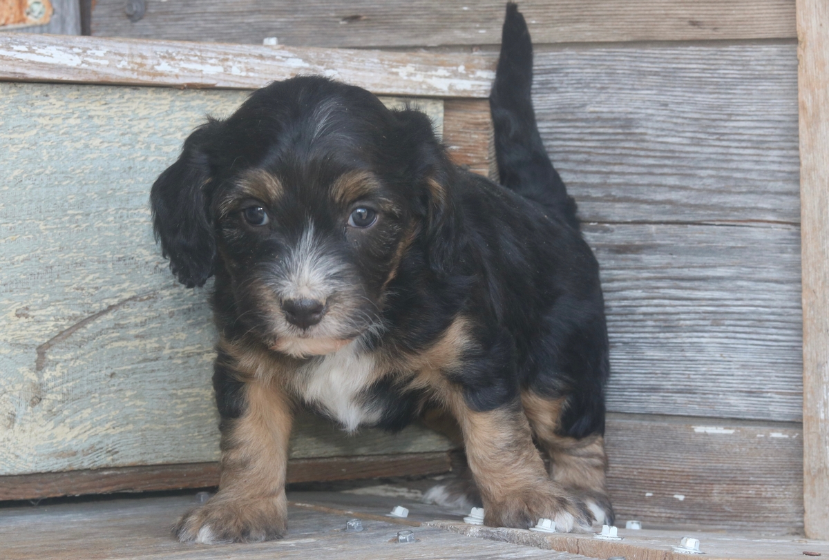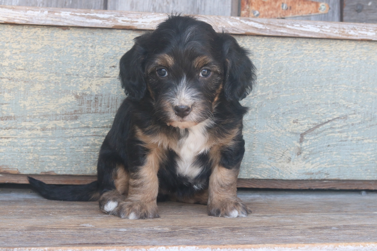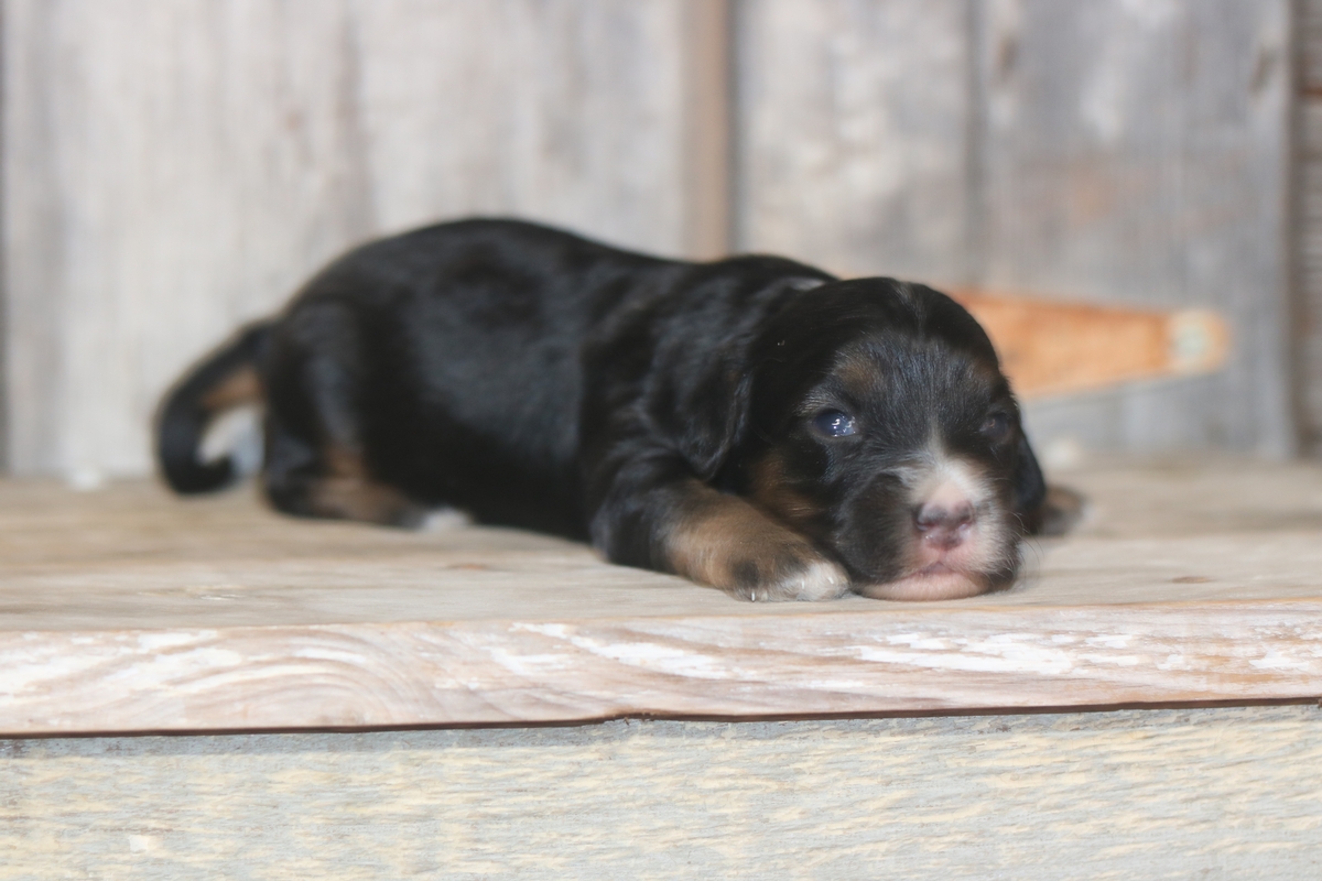 Omira is a bi-colored F1b Tiny Bernedoodle female that is expected to mature at approximately 15-30 pounds and will have a heavy/wavy coat and a shorter build. She was born on 2/3/2026 to Remi and Layne. Omira has a laidback temperament and weighs 3.10 pounds as of March the 14th.