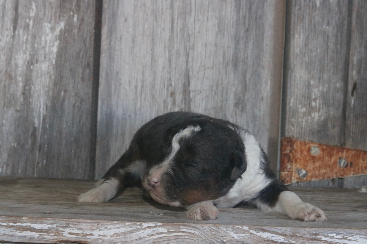 Pado, born to Remi and Layne is a Merle F1b Micro Mini Bernedoodle male with tri-colored markings. Pado is expected to mature under 25 pounds and will have a heavy-wavy coat.