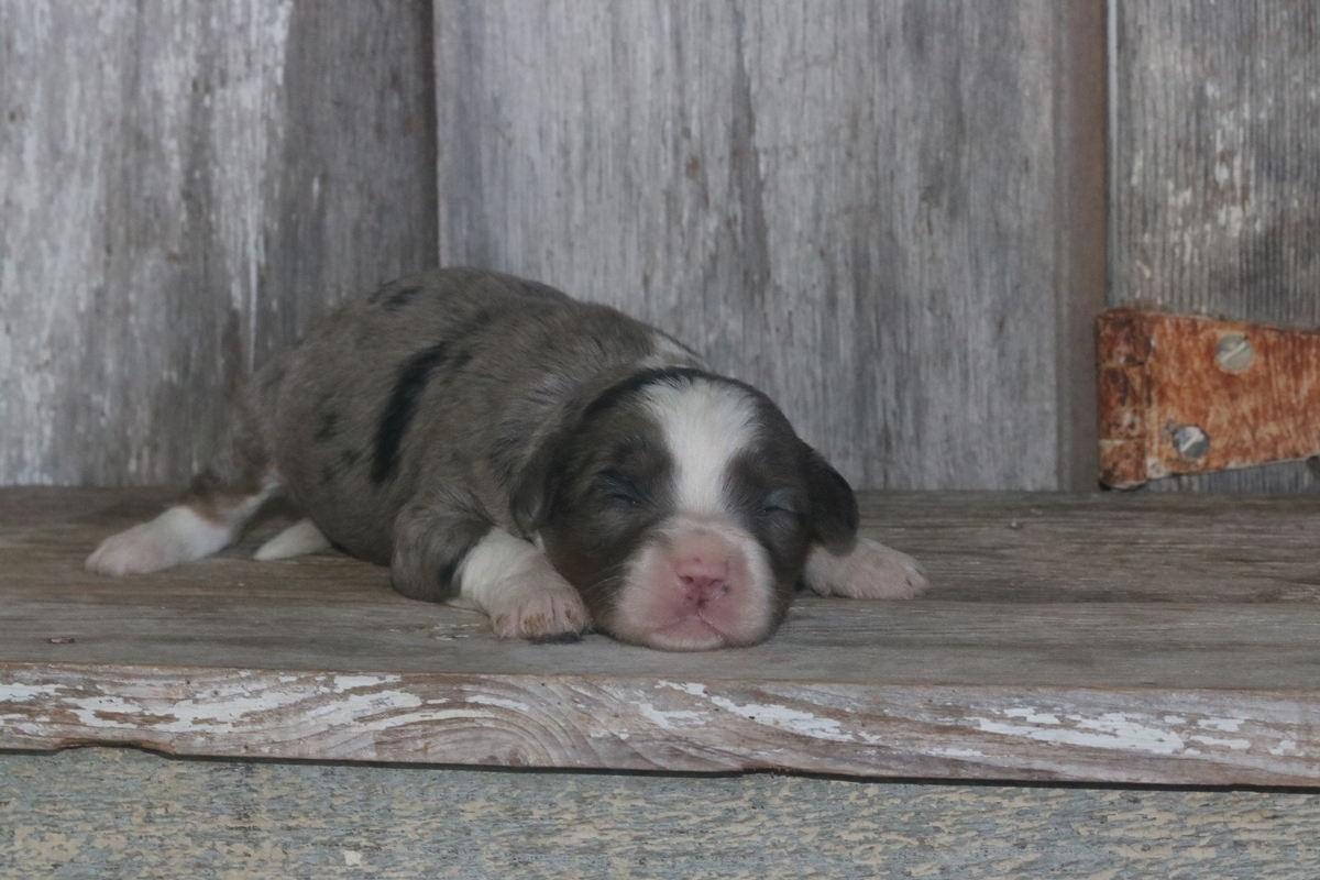 Panki was born to Sky and Layne on Feb the 3rd, he is a Merle F1b Tiny Bernedoodle male who has tri-colored markings. Panki is expected to mature under 25 pounds and will have a heavy-wavy coat.