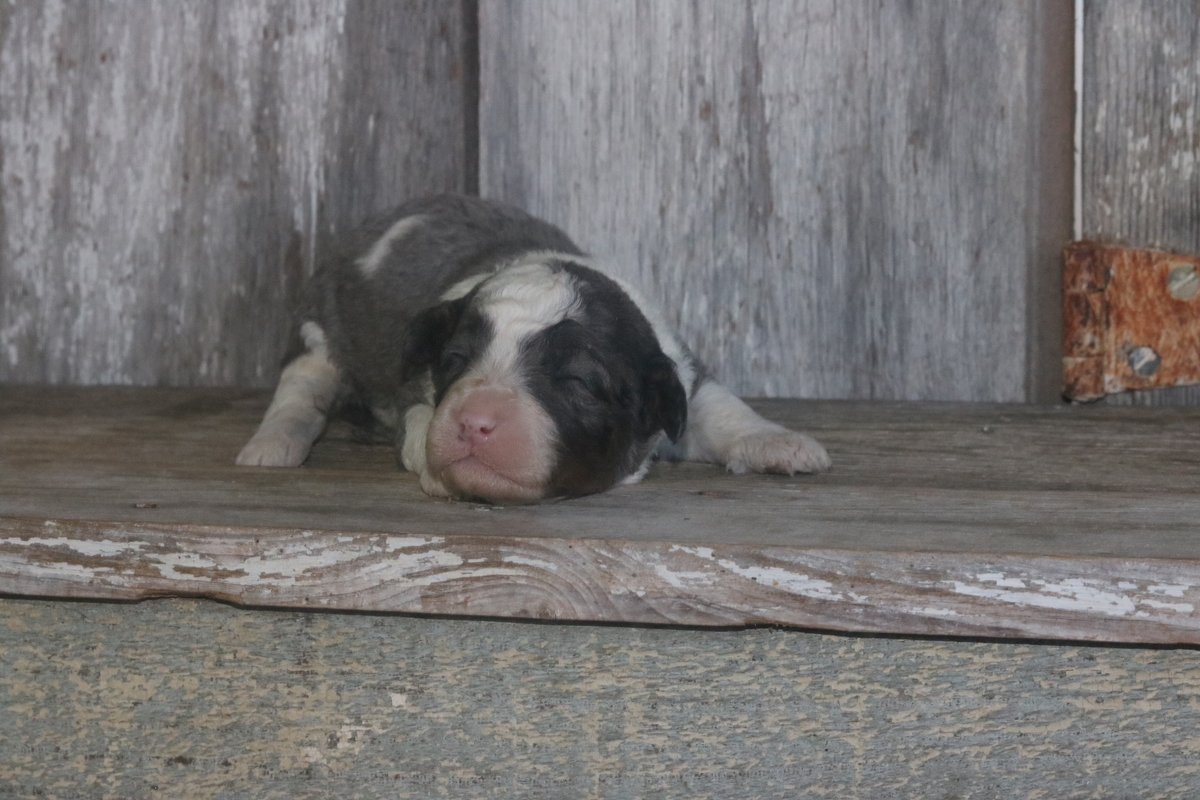 Penn, born to Remi and Layne is a Merle F1b Micro Mini Bernedoodle male with tri-colored markings. He is expected to mature under 25 pounds and will have a heavy-wavy Merle colored coat .