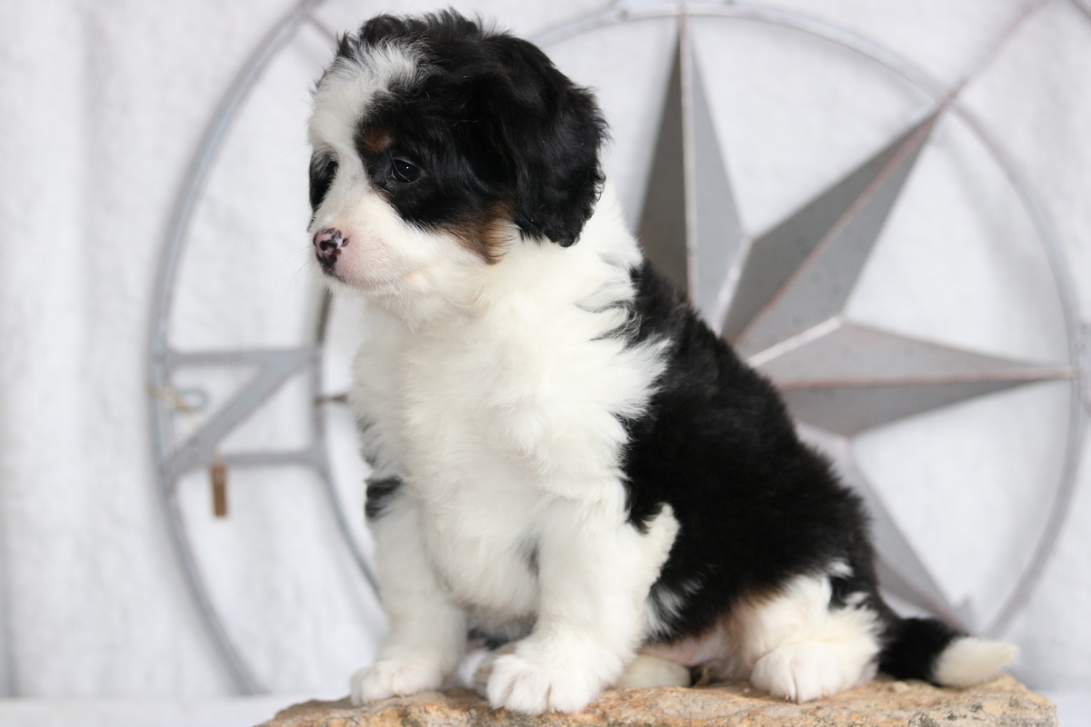 Qamra is A F1 Mini Bernedoodle girl that is expected to mature at appr. 25-45 lb and have a very Heavy, Wavey Tri color coat, Qamra weighs 4.8 pounds at 6 weeks old and is Rated as having an outgoing Temperament based off of her litter of 8 mini bernedoodle puppies. While she is still showing a decent amount of pink pigment in her nose, it will certainly be all black when she gets older and likely in a few more weeks. If you wish to reserve Qamra she can be reserved by making the NONREFUNDABLE deposit which will be a commitment for us to hold her until she is ready to go home by February 26th or soon after.