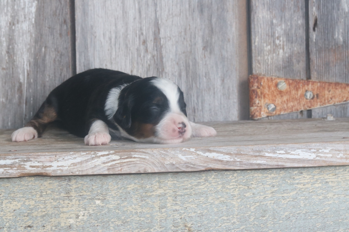 Reena is a F1 Mini Bernedoodle girl born to Phoebe and Bentley that is expected to mature at approximately 35-55 pounds and have a Heavy-Wavey Black Tri colored coat with tri colored markings.