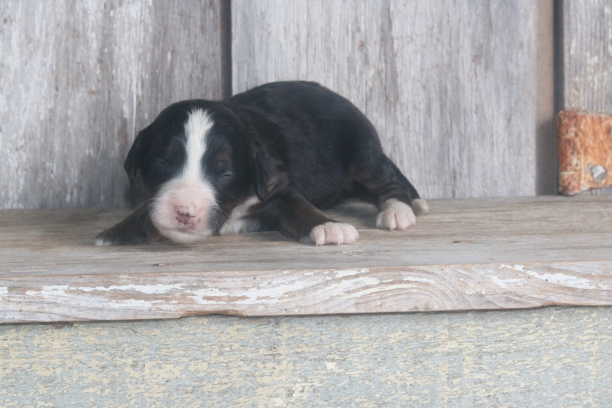 Reggi is a Traditional Black Tri F1 Mini Bernedoodle male that is expected to mature at approximately 35-55 pounds.