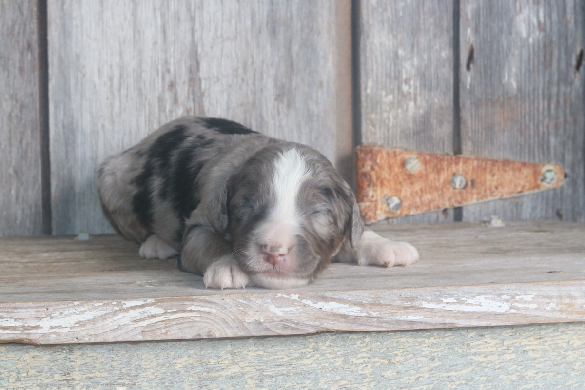 Rocket is a F1 Mini Bernedoodle male that is expected to mature at approximately 35-55 pounds and have a Heavy-Wavey Tri colored Merle coat.